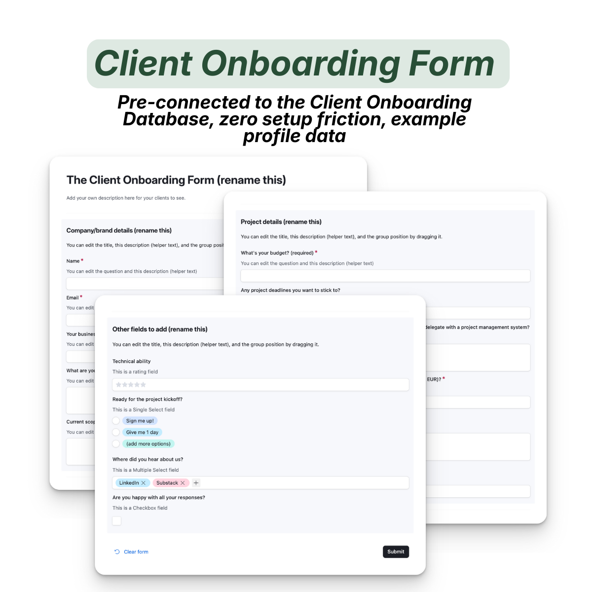 → Client Onboarding Form (pre-connected to your database, zero setup friction, example profile data)