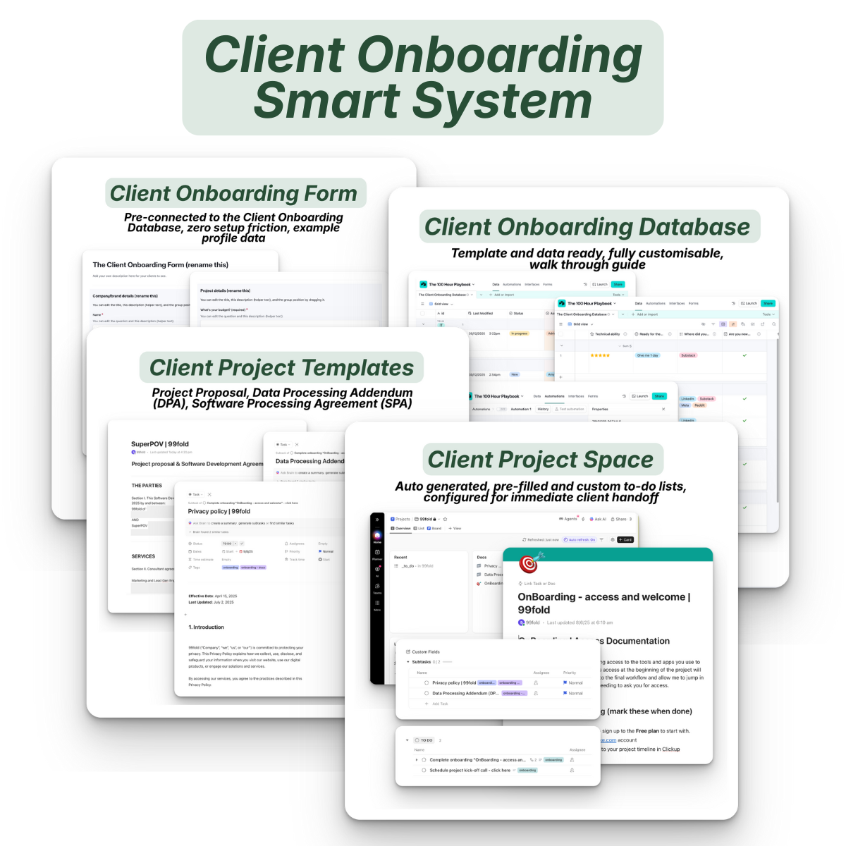 ↳ The new client project space contains all documents, templates, and guides: Project Proposal, Data Processing Addendum (DPA), Software Development Agreement (SDA), custom to-do list, (Clickup)