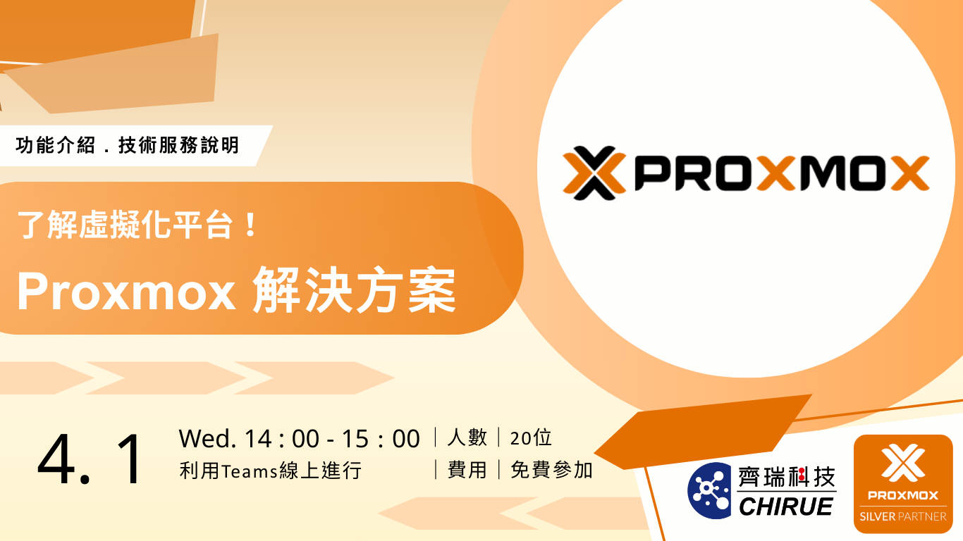 快報名瞭解,滿足 90% 企業的虛擬化平台 Proxmox,與齊瑞科技技術服務!