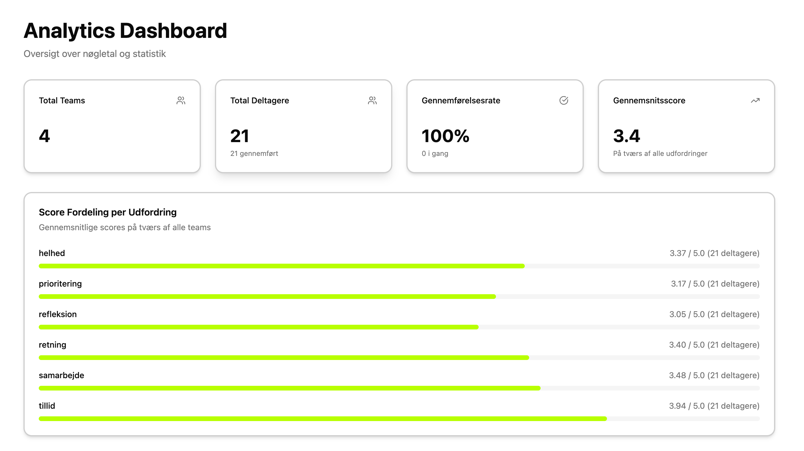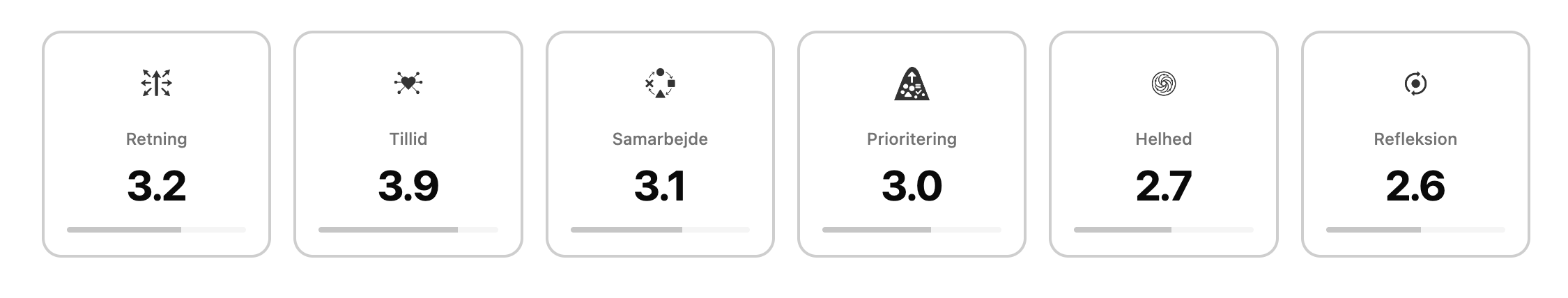 Få et hurtigt overblik over hvor jeres lederteam står på de seks udfordringer, Retning, Tillid, Samarbejde, Prioritering, Helhed og Refleksion, så I ved hvor det giver mest værdi at sætte ind.