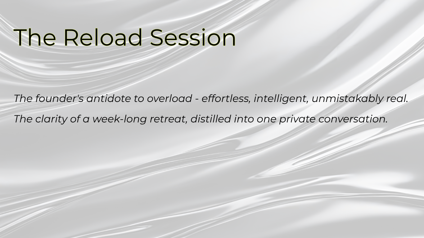 The Reload Session is your pause. A quiet, intelligent conversation designed for founders and leaders who think fast, feel deeply, and need a moment to breathe.