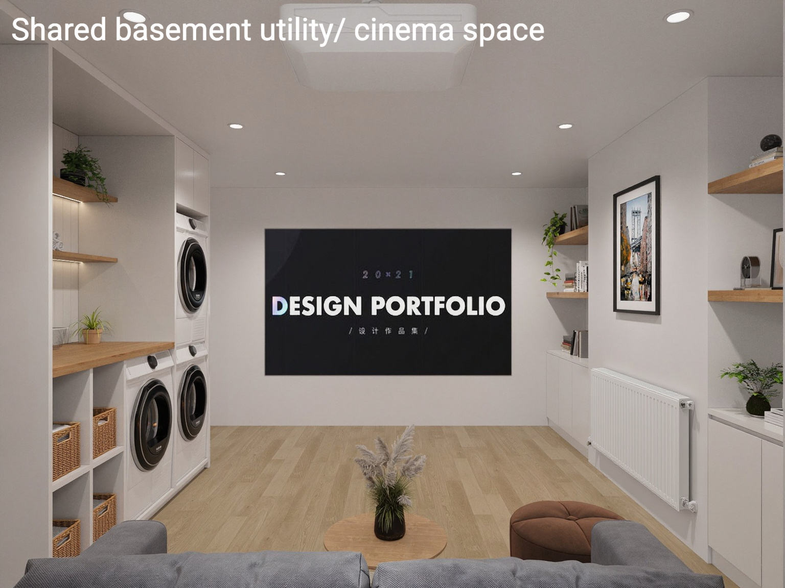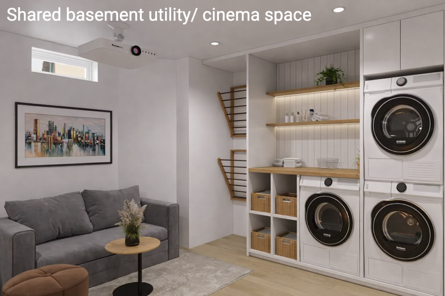 The basement consists of a utility room with 2 washers, a dryer and drying racks, plus a cinema space with projector that’s perfect for relaxing after long shifts or enjoying time together.