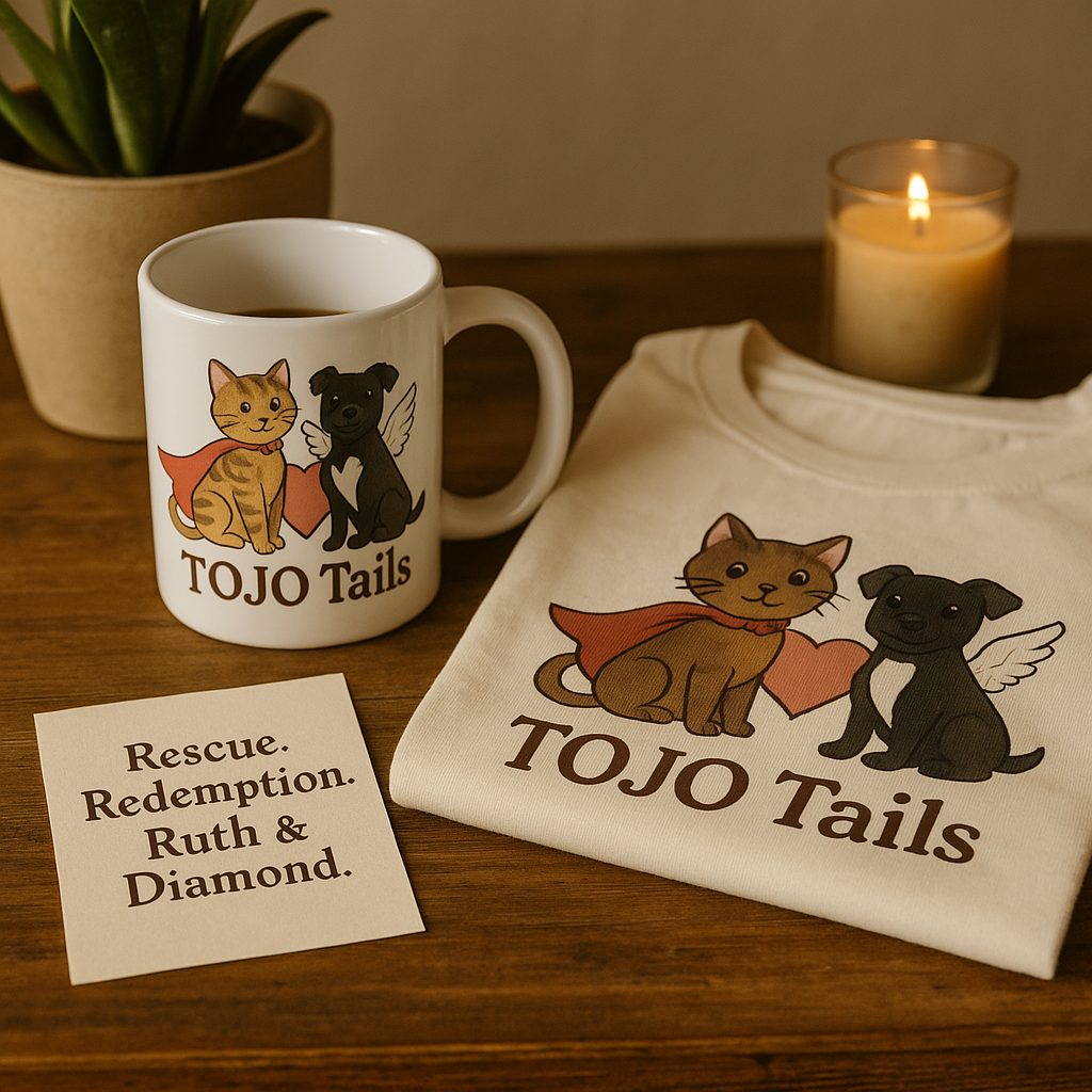 TOJO Tails → telling the stories of rescued animals like Ruth 🐾 and Diamond 🐾 through books, art, and merch — while giving back to rescue and TNR efforts.