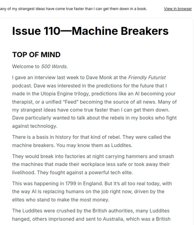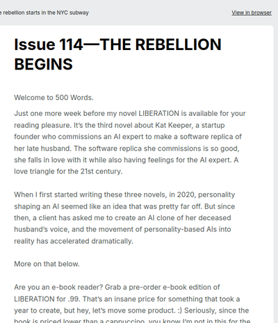 500 Words is about the ethics of AI, with essays on the preservation of human creativity and connection and the writing life. It's published every other week or so. Free to subscribe.