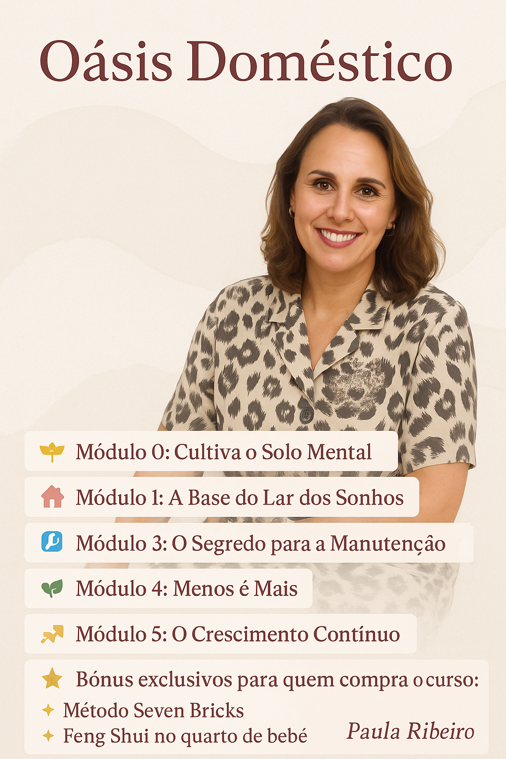 Para os cursos online, recomendamos ter um caderno para anotações e alguns itens básicos de organização doméstica, como caixas e pastas. Caso precises de materiais adicionais, vamos sugerir durante as aulas, mas a maioria das técnicas pode ser implementada com o que tu já tens em casa.