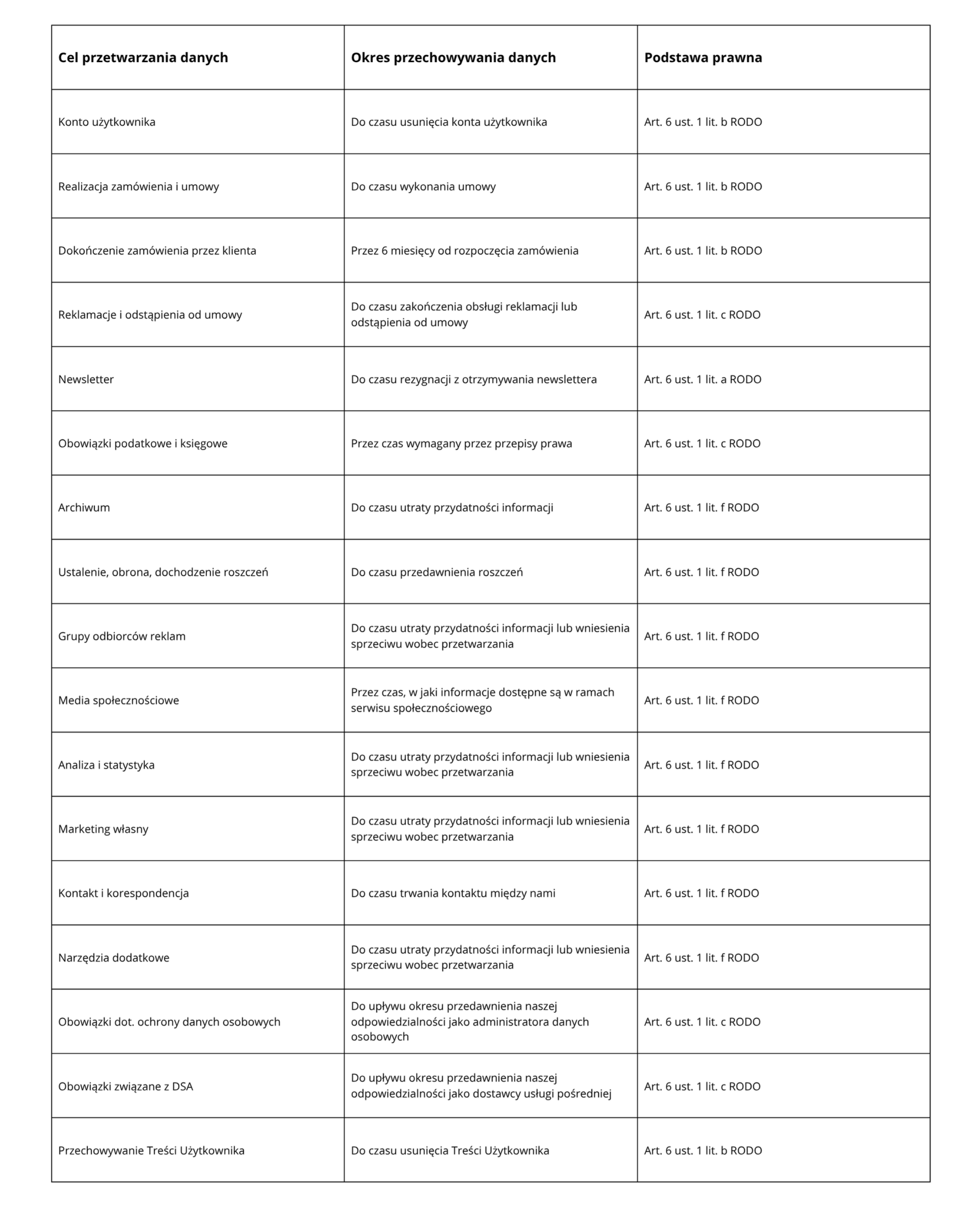 Twoje dane osobowe będą przechowywane przez okres niezbędny do realizacji celów, dla których zostały zebrane, a następnie przez okres wymagany przepisami prawa lub do czasu wycofania zgody na ich przetwarzanie.