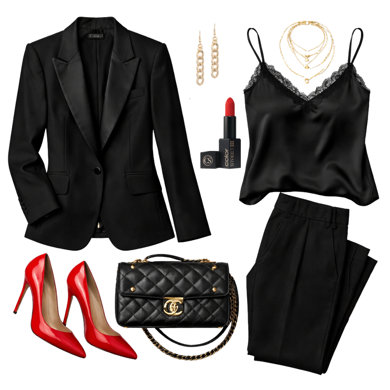 a) chic black with a statement piece