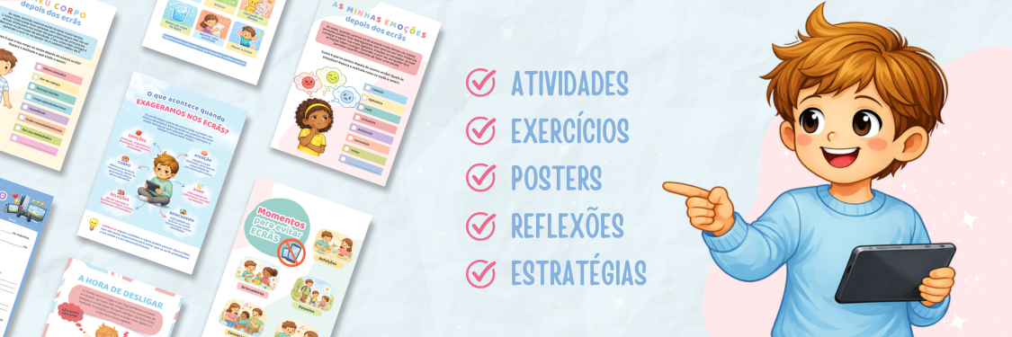 Através desta seleção de recursos, as suas crianças irão refletir sobre o uso dos ecrãs e perceber o seu impacto nas emoções, no corpo, na atenção e nas relações, explorando recursos práticos que promovem a responsabilidade e a construção de hábitos digitais mais saudáveis, no dia a dia.