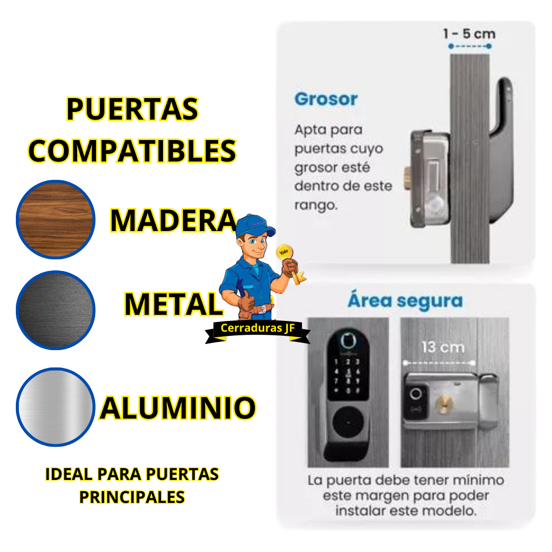 Compatible con puertas de madera o aluminio, con grosor de 40–80 mm.