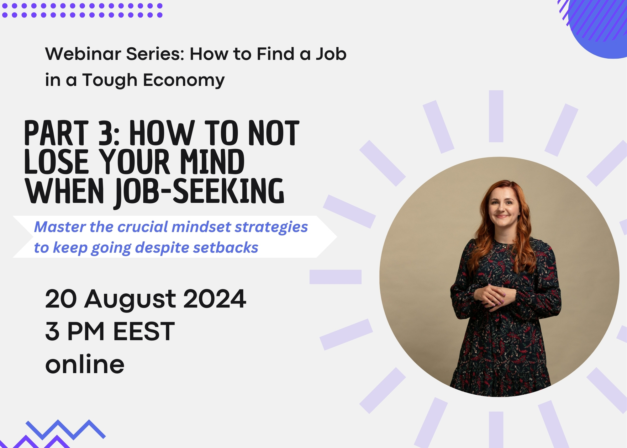 Join me in this 3-part webinar series, where I'll teach you the key success components of finding a job in a tough economy without losing your mind.
