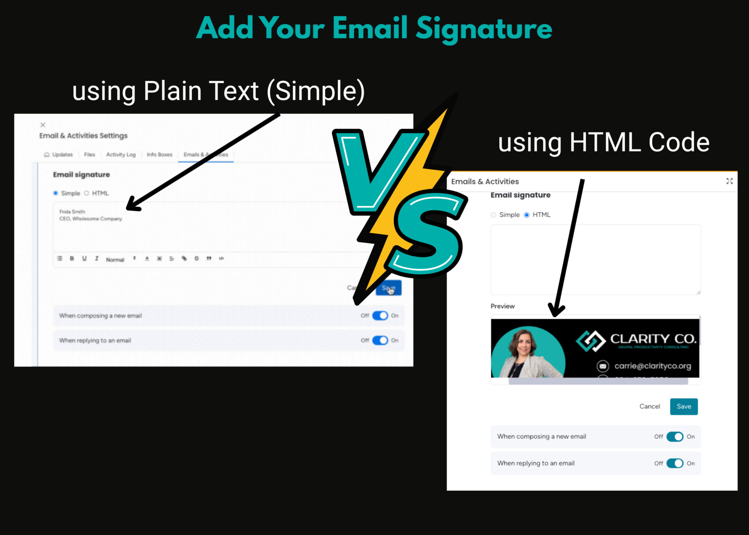 The Emails & Activities feature in monday.com CRM lets you integrate your email account, but it doesn’t automatically pull in your branded email signature. Instead, you’re given the option to recreate it—but without HTML code, you’re limited to a simple, plain-text signature.