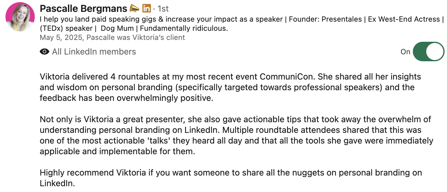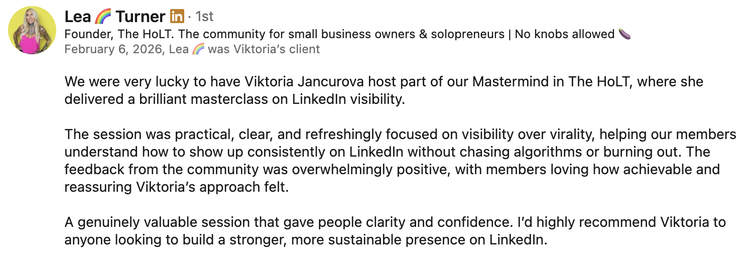 I don’t subscribe to the whole go viral and become a millionaire culture because 99% of the people I speak to don’t actually need to go viral on LinkedIn to find their next client.