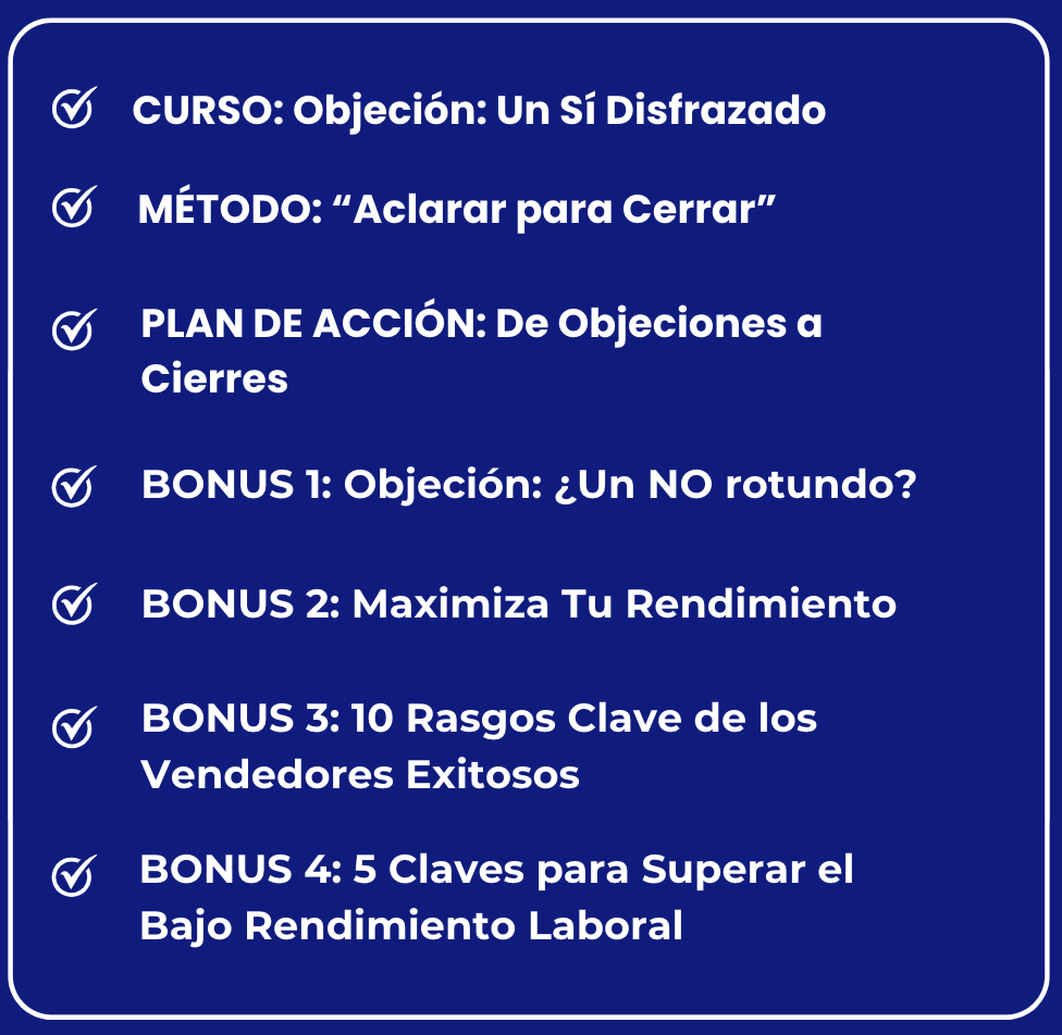 LECCIÓN 1: Cómo mantener la mentalidad adecuada ante las objeciones - LECCIÓN 2: Cómo manejar asertivamente las objeciones aplicando mi Método “Aclarar para Cerrar” - LECCIÓN 3: 17 técnicas para combatir efectivamente las objeciones (Parte I)