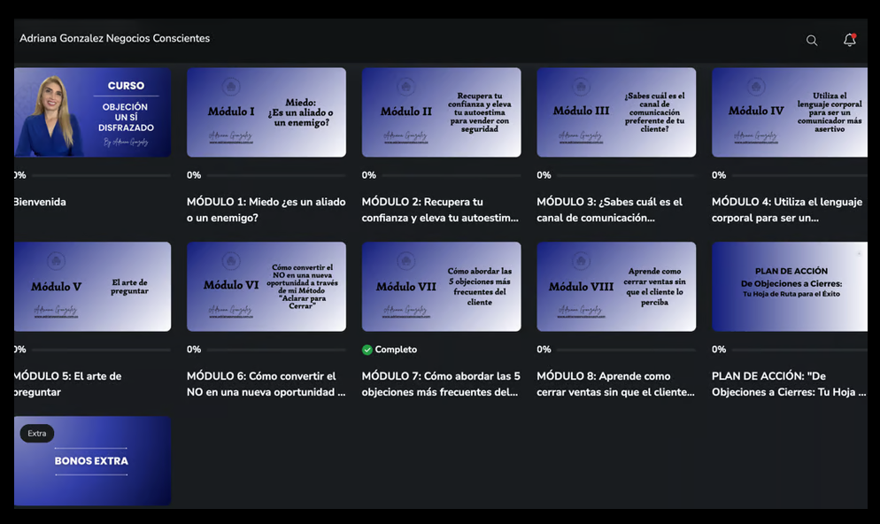 Un recorrido práctico de 8 módulos + un plan de acción que te llevan de sentir miedo y bloqueo a responder objeciones con claridad, seguridad y método en solo 15 días.