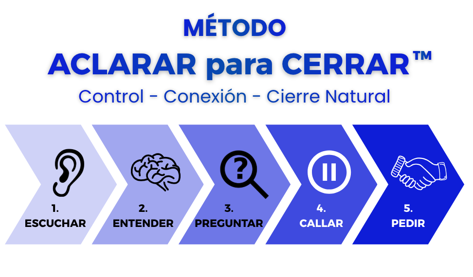 Un proceso simple de cinco pasos que te permite sentirte en control, escuchar de verdad y llevar cada conversación hacia un cierre natural.