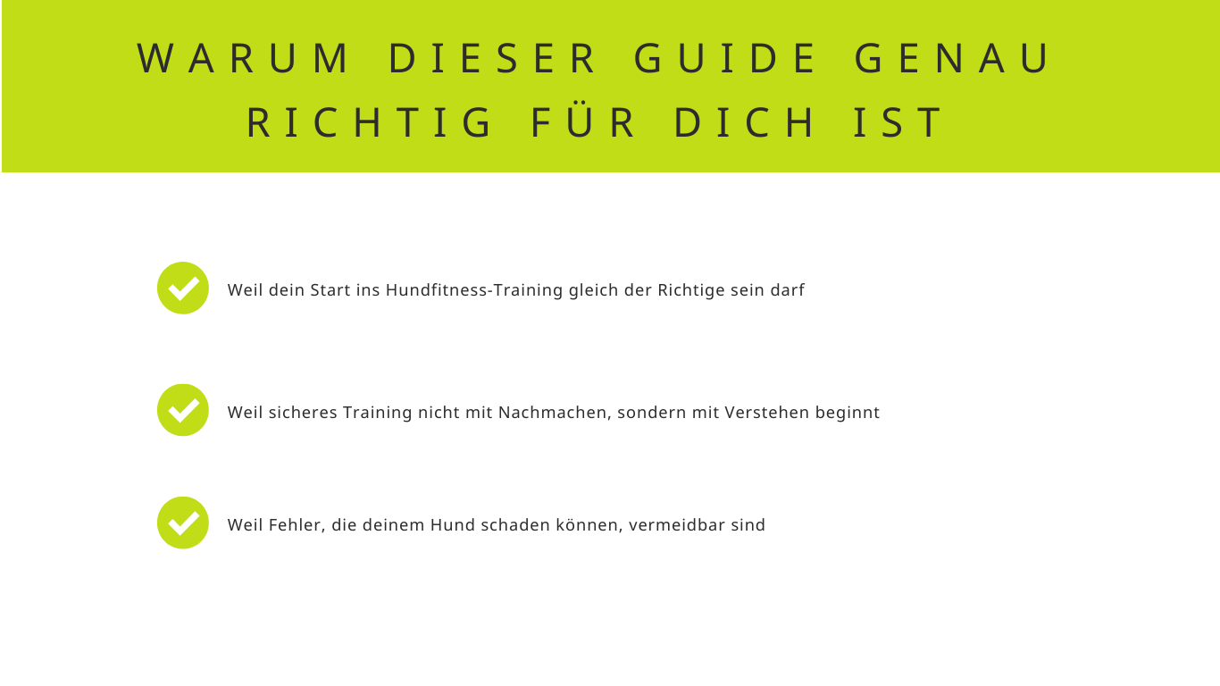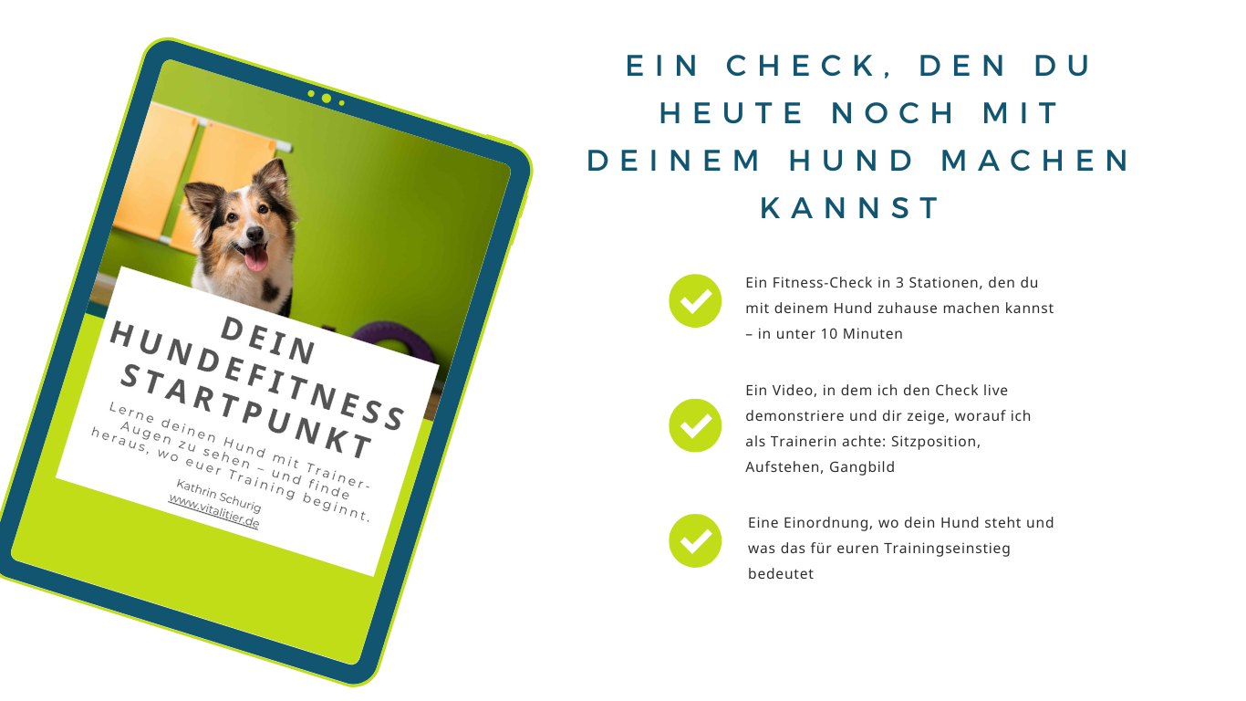 Hole dir jetzt den 0,- EUR Guide mit PDF & Video! Und erkenne euren Startpunkt im Hundefitnesstraining!