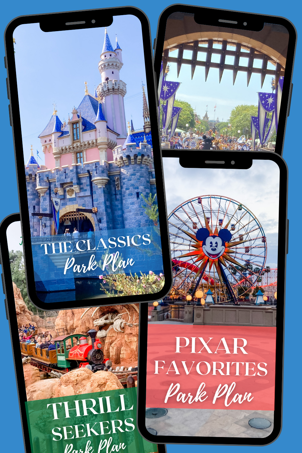There are 4 themed itineraries included in your purchase. Story Book: My most popular Park Plan for kids and kids at heart. Focus on rides to ease little ones into the Disney experience while enjoying fairytale favorites. Pixar Favorites: California Adventure Park one day plan featuring Pixar favorites and other popular family attractions. Our only full day plan for DCA. Includes Early Entry Plan for guests of Disneyland Resort Hotels. Thrill Seekers: This plan is designed for roller coaster lovers and thrill enthusiasts! It also features some Disneyland Classics to round out the day. And Classics: A family favorite, especially for multi-gen trips with grandparents. Ride the classics at Disneyland, perfect for adults and small children who love Disney history and want an overview of the theme park! Focus on opening day attractions with a touch of Walt Disney himself.