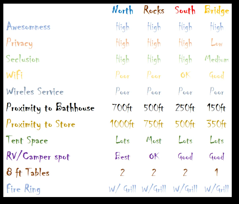 Stoney Creek Campground features four large campsites: North, Rocks, South, and Bridge. The Bridge site is closest to the river and offers the best WiFi. Amenities on-site include: