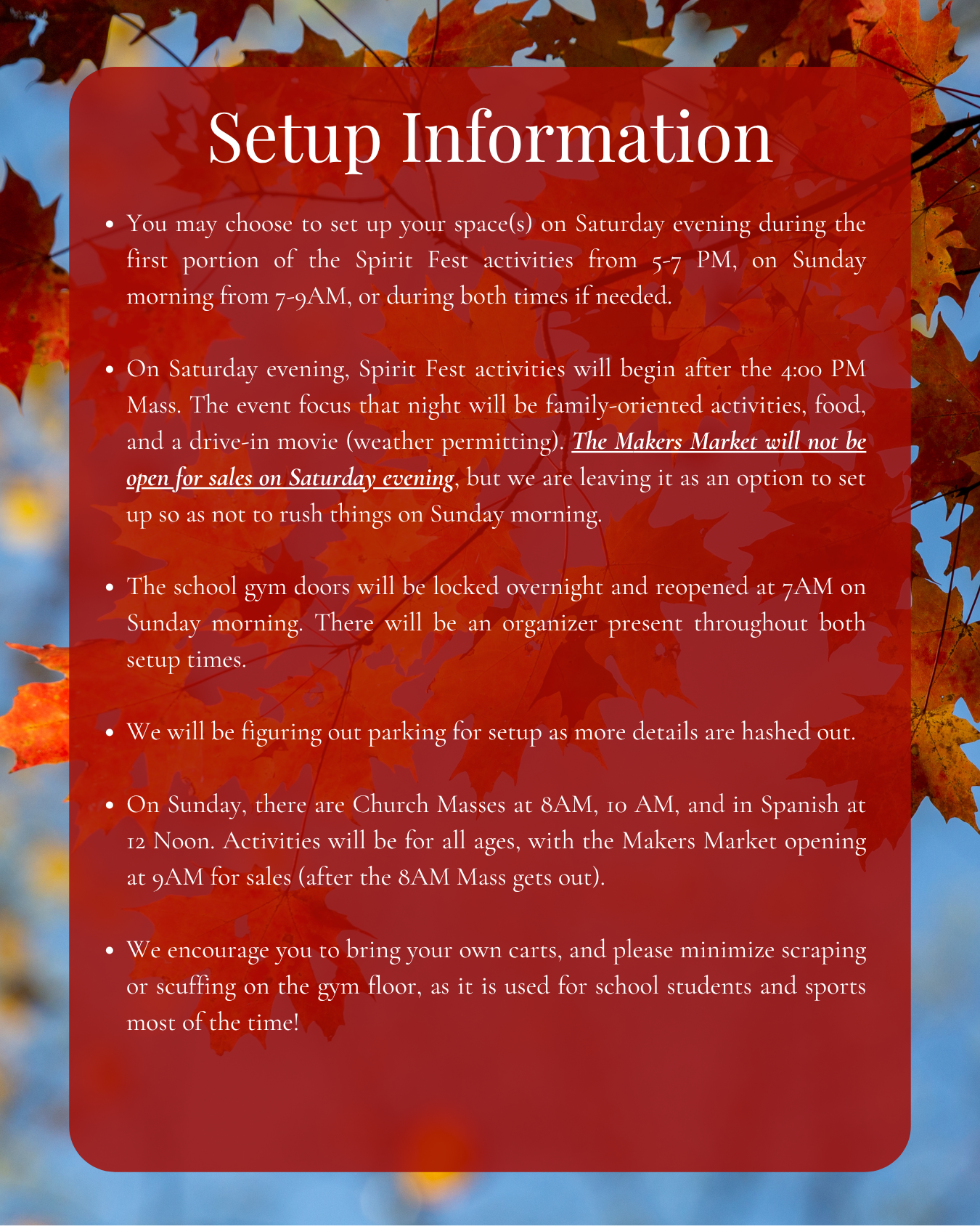 As the organizers are Catholic, we also want to be able to make it to Mass that weekend! If we ran it both Saturday and Sunday, it would be difficult to fulfill our obligation. We still expect great turnout on Sunday with attendees of all ages who look forward to live music, raffles, the Silent Auction, great food, games, and so much more!