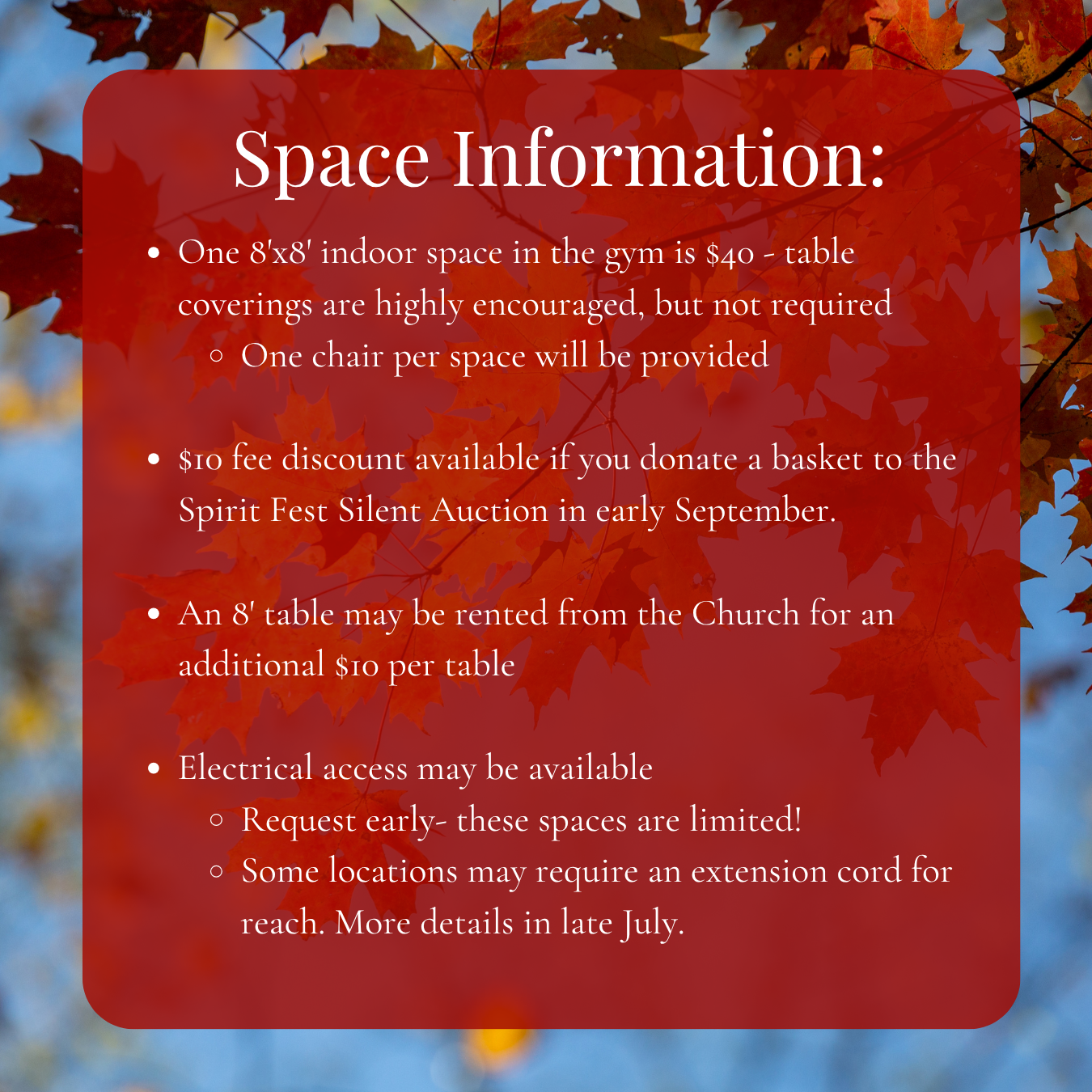 Add-on options for table rental ($10/table) and electrical access (no extra cost, but limited)