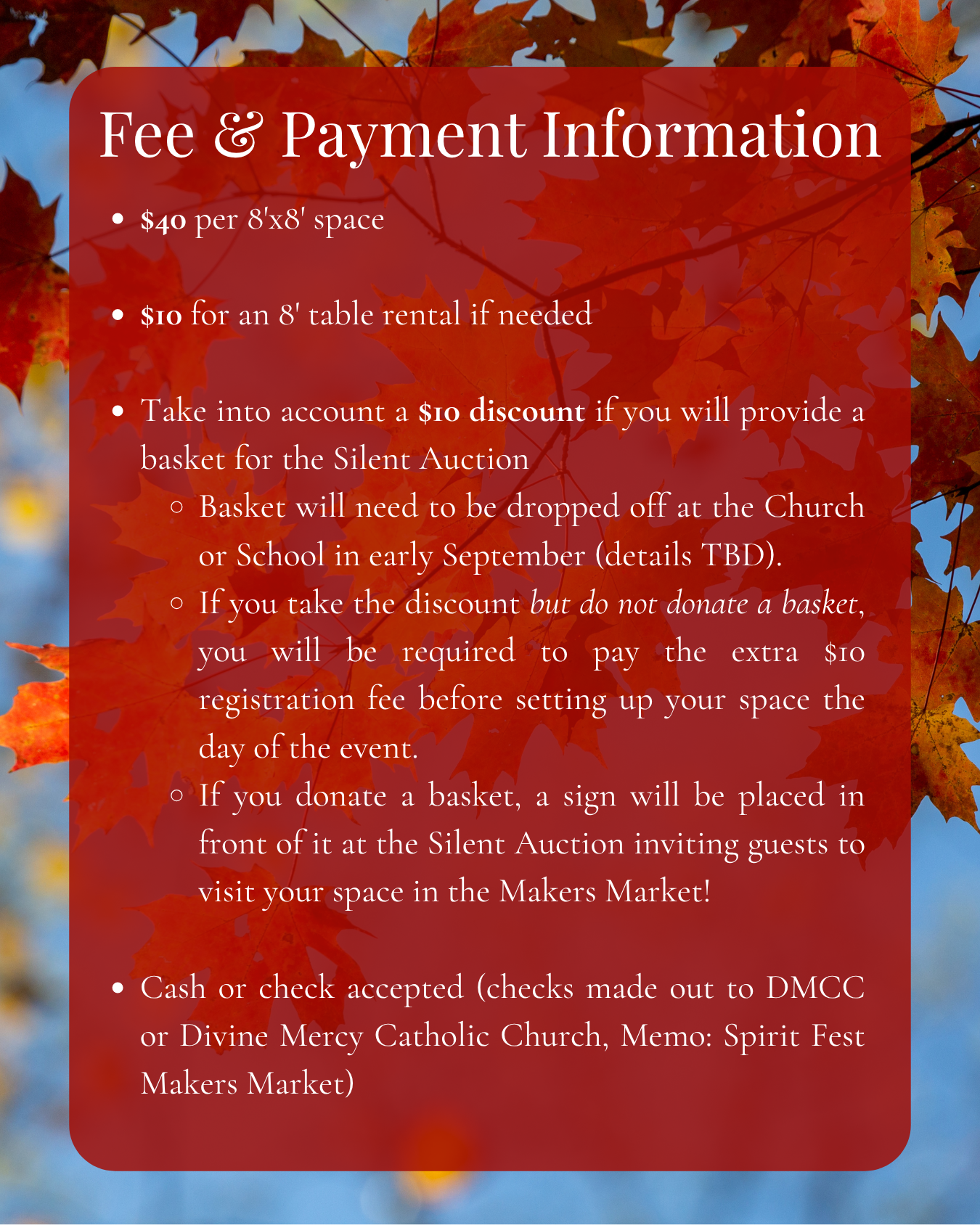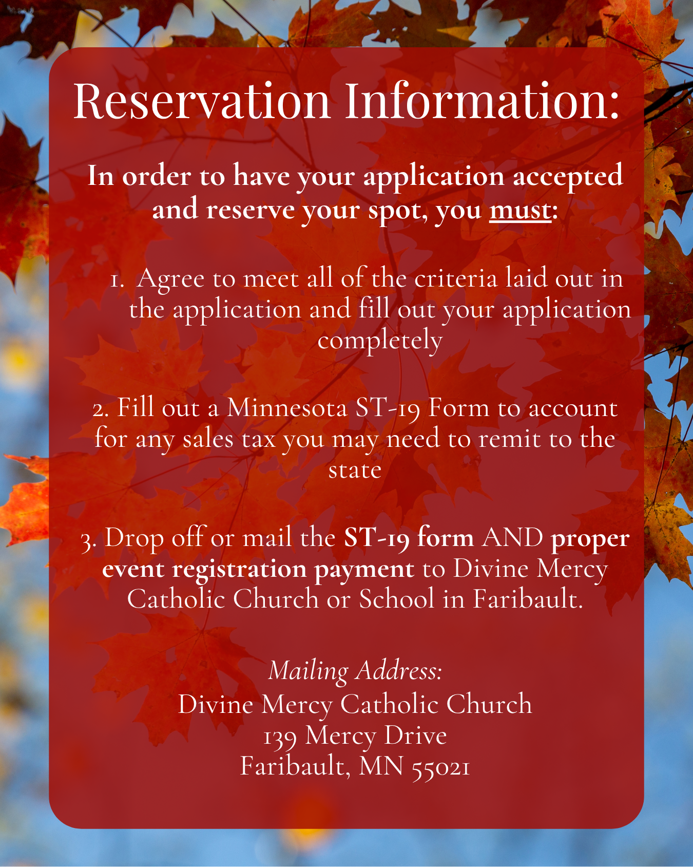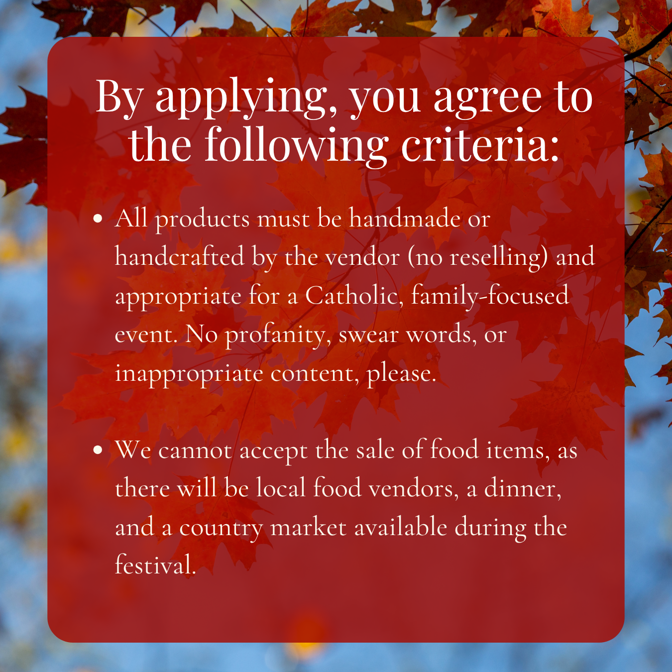 You must also meet the handmade/handcrafted + family-friendly product criteria and submit both payment to Divine Mercy Catholic Church or School (mail or drop off in-person) AND a Minnesota ST19 form (or qualified exemption statement).