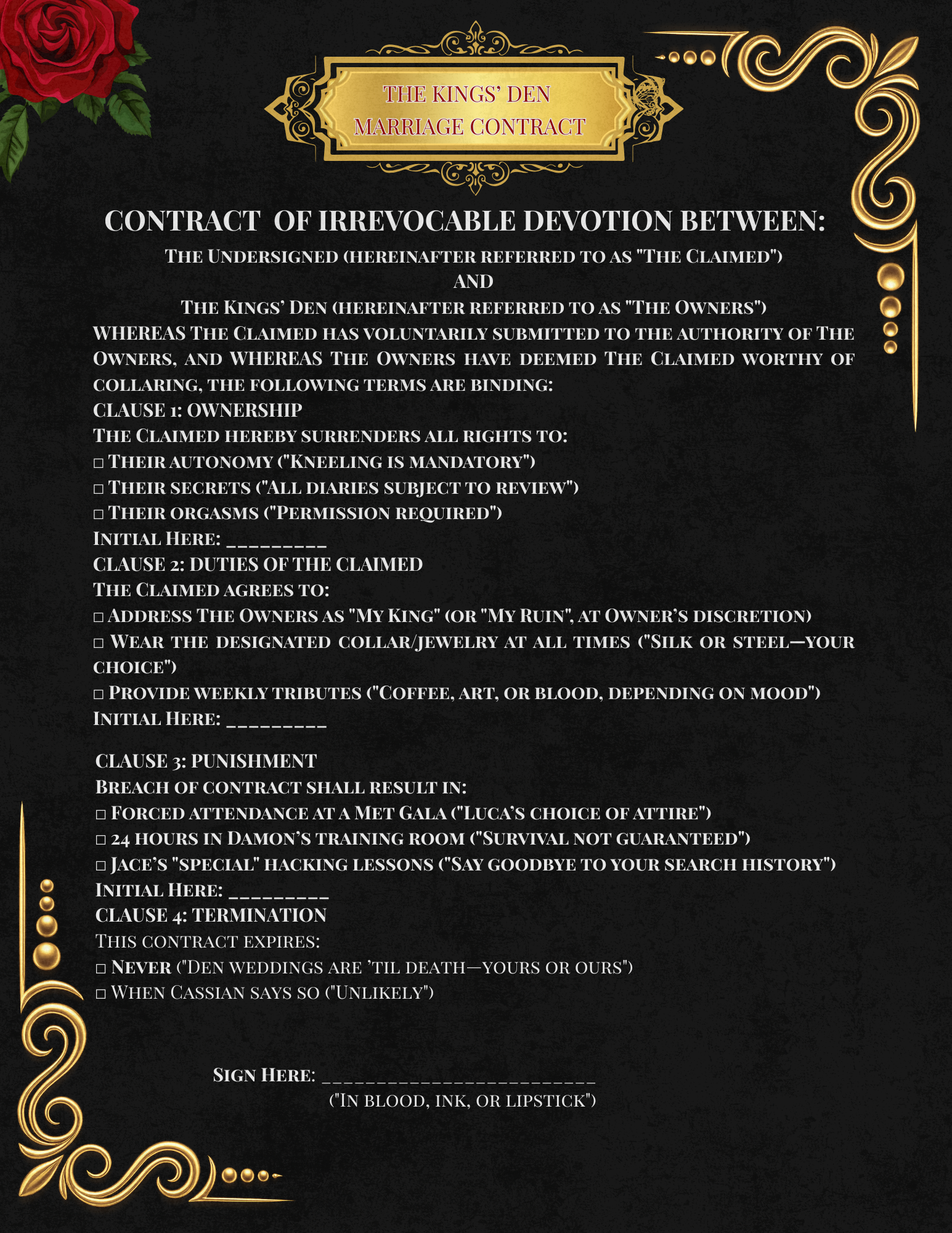 ✔ Playfully twisted clauses (from "Permission-to-Come" rules to "Punishment Options").