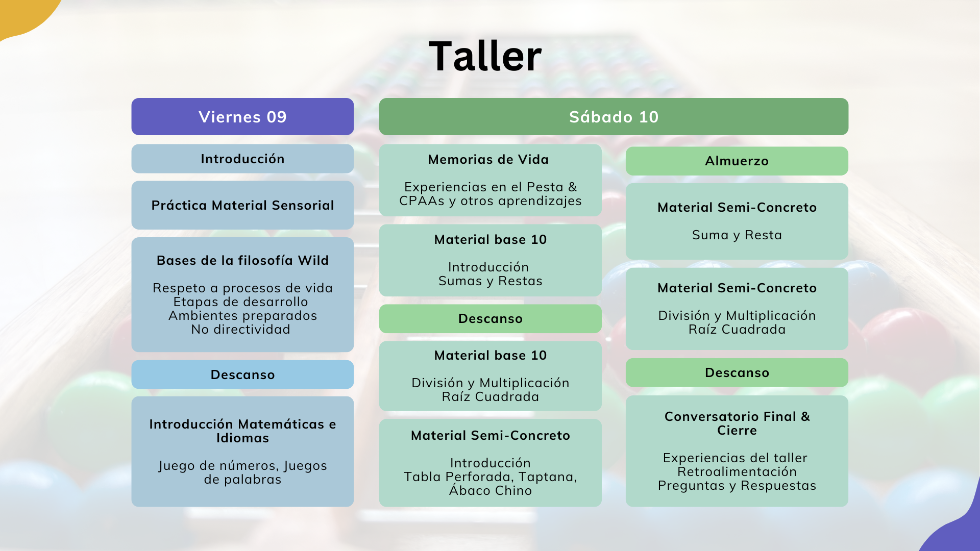 Taller interactivo de 12 horas, habrán espacios para compartir experiencias y conversar, con demostración y práctica de materiales didácticos, estructurado por etapas.