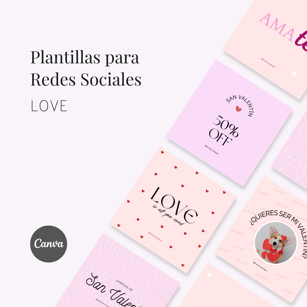 Descarga GRATIS estas plantillas de temática LOVE ideales para tus publicaciones de Día de Los Enamorados, totalmente editables en Canva.