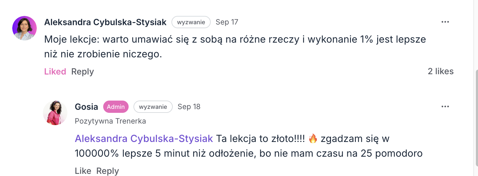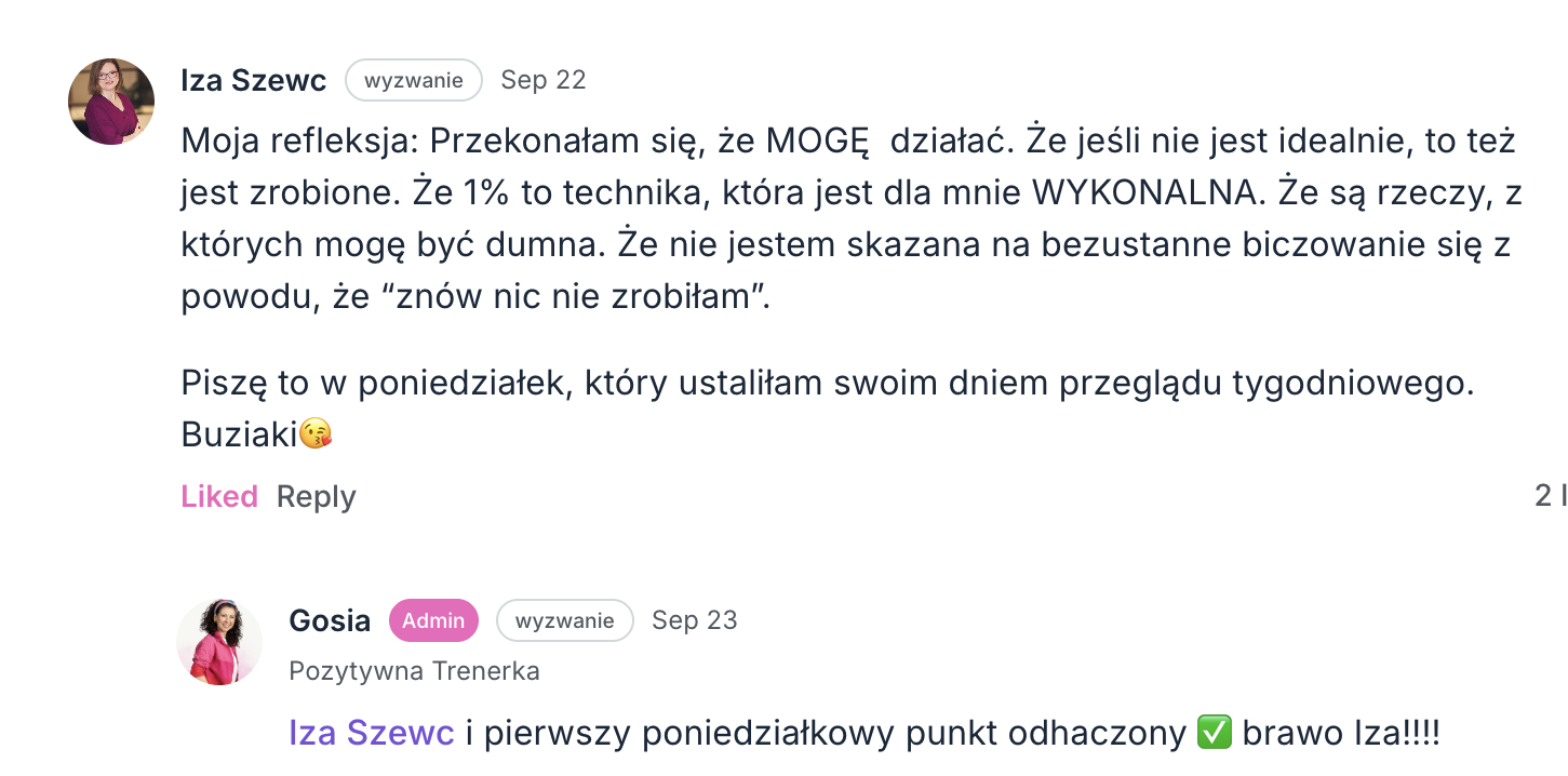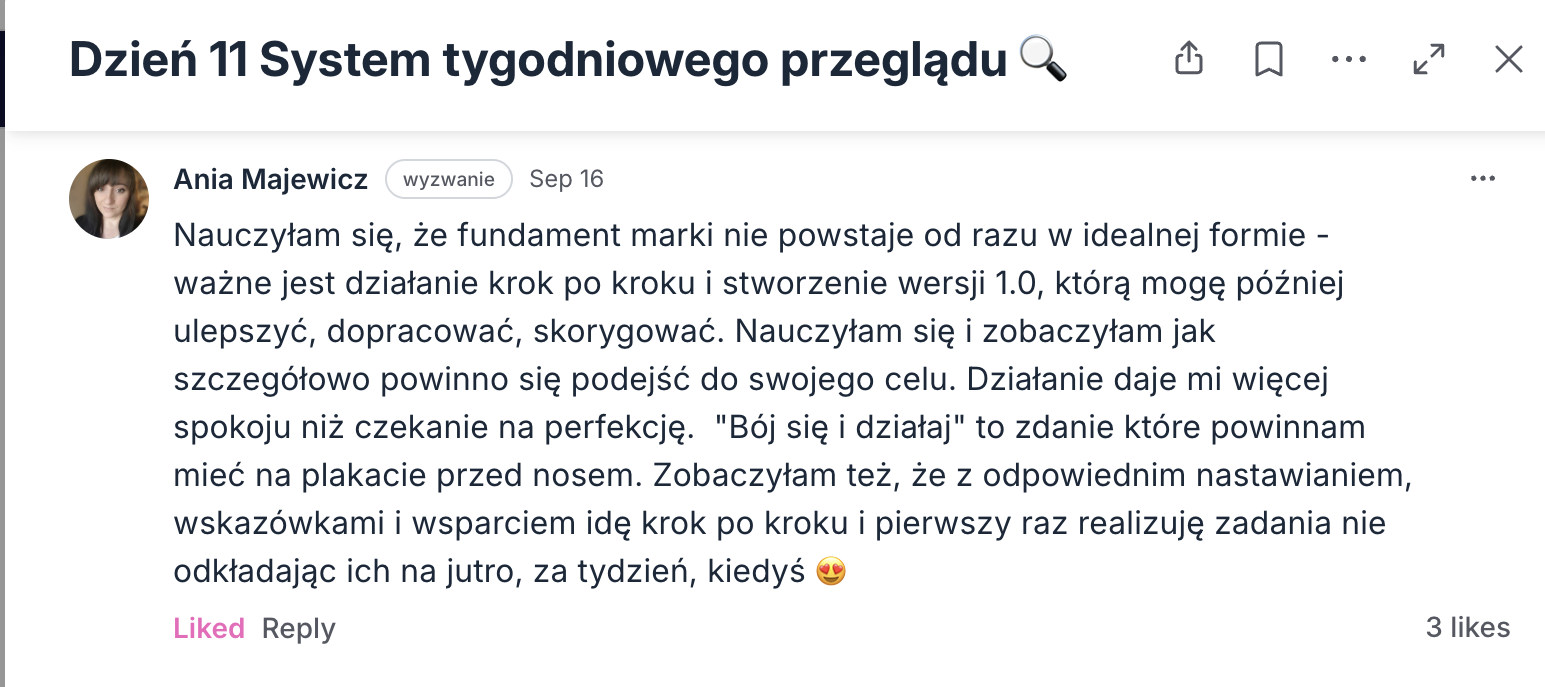 Nagrania nie są wysyłane na maila. Wszystkie materiały i dokumenty znajdziesz tylko na platformie. To celowe: dzięki temu skupiasz się na działaniu tu i teraz, zamiast odkładać na „kiedyś”. Krótko mówiąc: mniej archiwum, więcej efektów.
