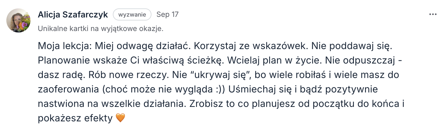 Jeśli jednak nie zdążysz, będziesz mieć dostęp do platformy jeszcze 2 tygodnie po wyzwaniu i okazję, aby się ze mną skontaktować, gdy tylko będziesz tego potrzebować.