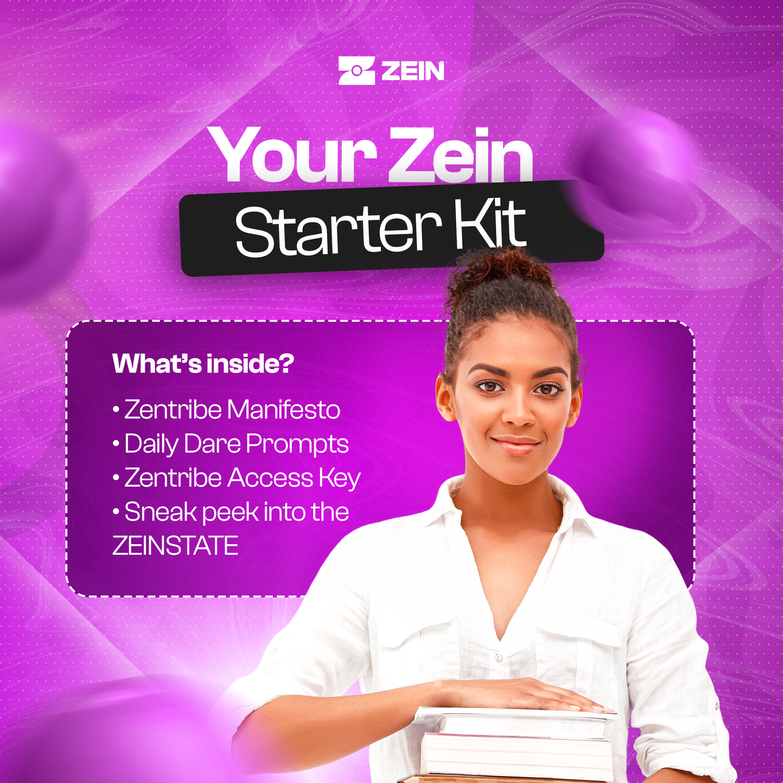 The Zein Starter Kit is your launchpad into the Zein journey. Over two weeks, you’ll get the Zentribe Manifesto, Daily Dare Prompts, access to our private community, and a sneak peek into the ZEINSTATE. Each piece helps you take action, connect with others, and kickstart your growth in Zein