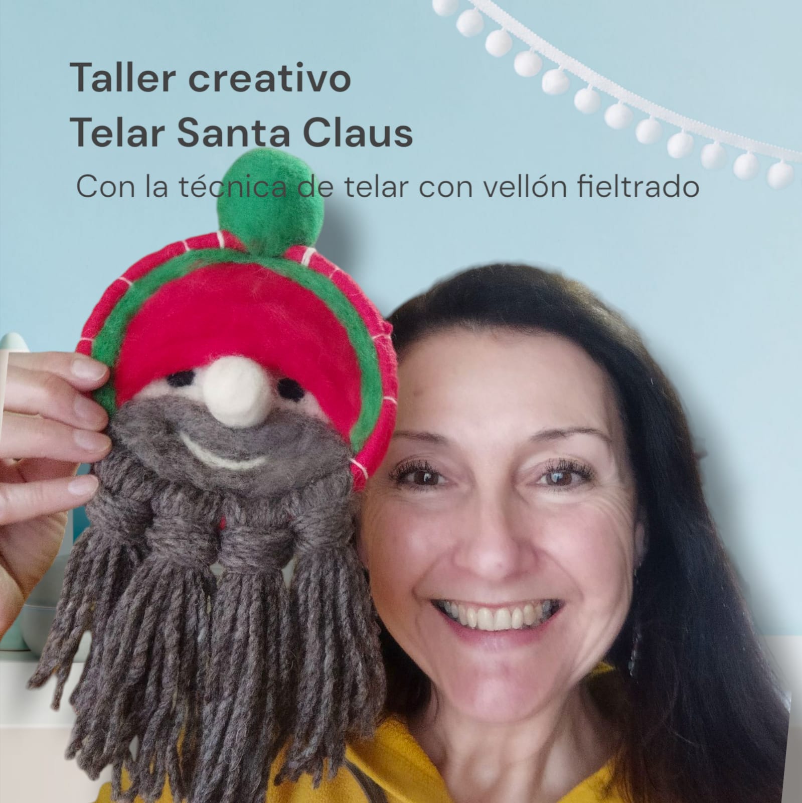 Navidad está en el aire y la decoración navideña en tu hogar nunca es suficiente. ¡Te encantará e Telar redondo de Santa Claus! Soy Gise Martel y te invito a que aprendas, paso a paso y desde cero, a realizar el telar redondo Santa Claus. Aprenderás a cubrir el marco redondo con lana, a realizar la urdimbre en redondo, tipo rayos de bicicleta, a tejer la base de tu telar con vellón y luego a darle forma de Santa Claus, con su barba, su gorro, su pompom, su nariz prominente, todo con la técnica de vellón fieltrado o agujado. Esta técnica consiste en dibujar y pintar con vellón un diseño, que en este caso es Santa Claus o Viejito Pascuero (como se dice en mi país, Chile). Luego le darás expresión con su sonrisa y sus ojos. Finalmente, darás las terminaciones para conseguir una creación prolija y profesional. Se trabaja con un aro, que en este caso, es el aro interior de un bastidor para bordar, con vellón, con aguja para agujar o fieltrar el vellón, con hilo de algodón para hacer la urdimbre, con lana para hacer la barba larga, con aguja lanera y con un cojín grueso, es espuma idealmente, sobre el cual agujar el vellón. Este Santa, te dará la pauta para crear tus propios diseños de Santa, cambiando la expresión de su cara, cambiando los colores, con aros de diferentes tamaños, con narices más grandes o más pequeñas, para así decorar tu hogar con tus creaciones o para regalar, ésta navidad y todas las que vienen. Haz volar tu imaginación a partir de este diseño.