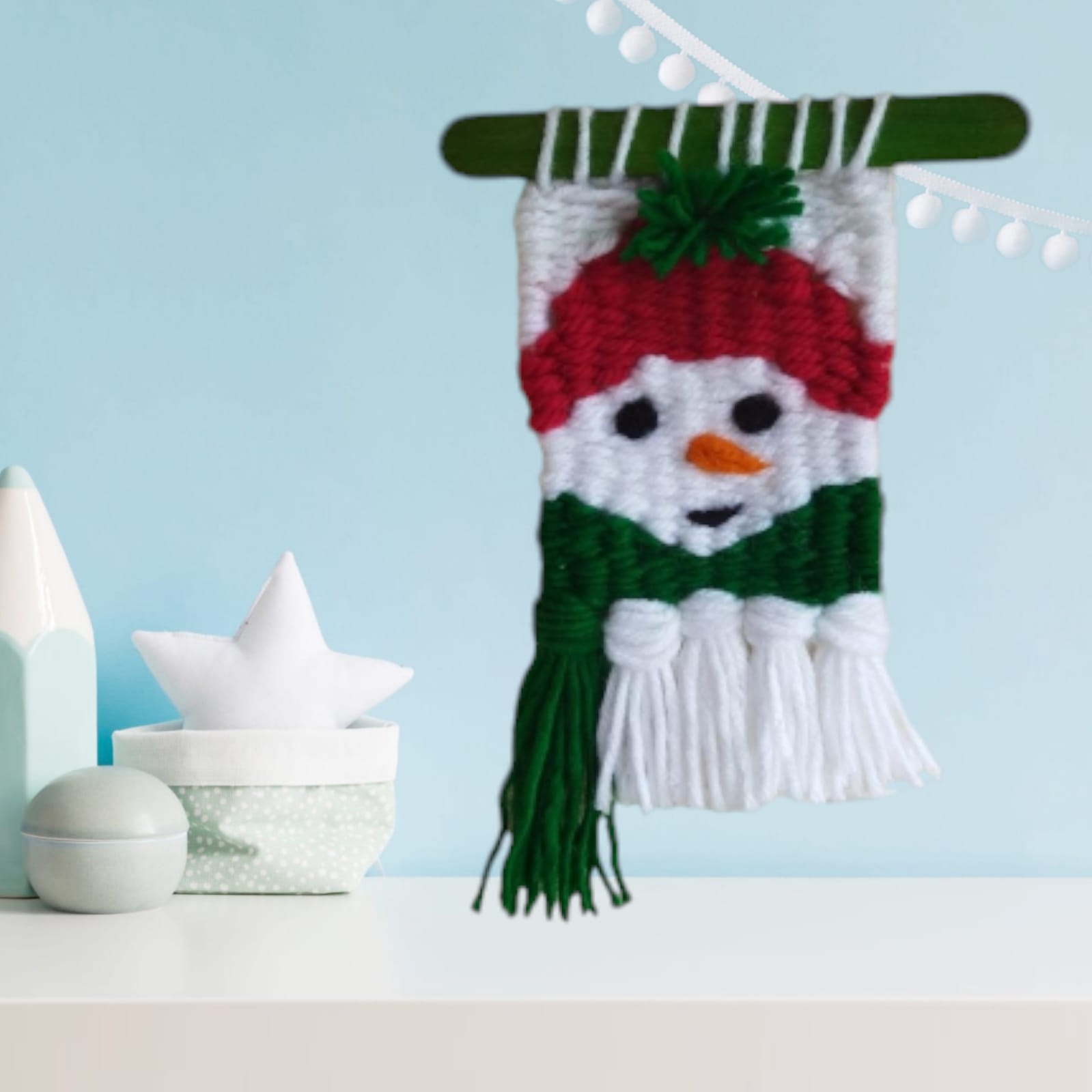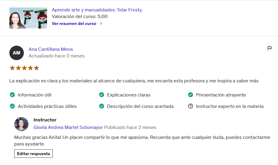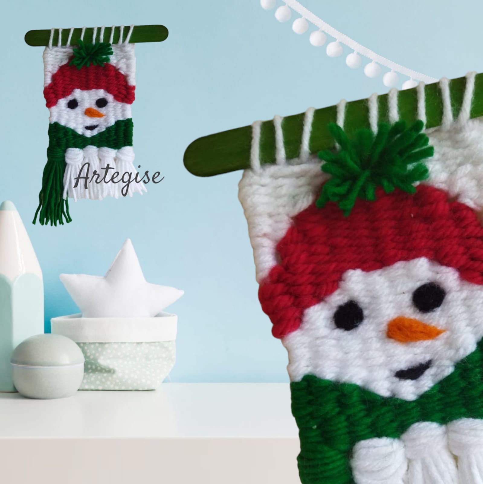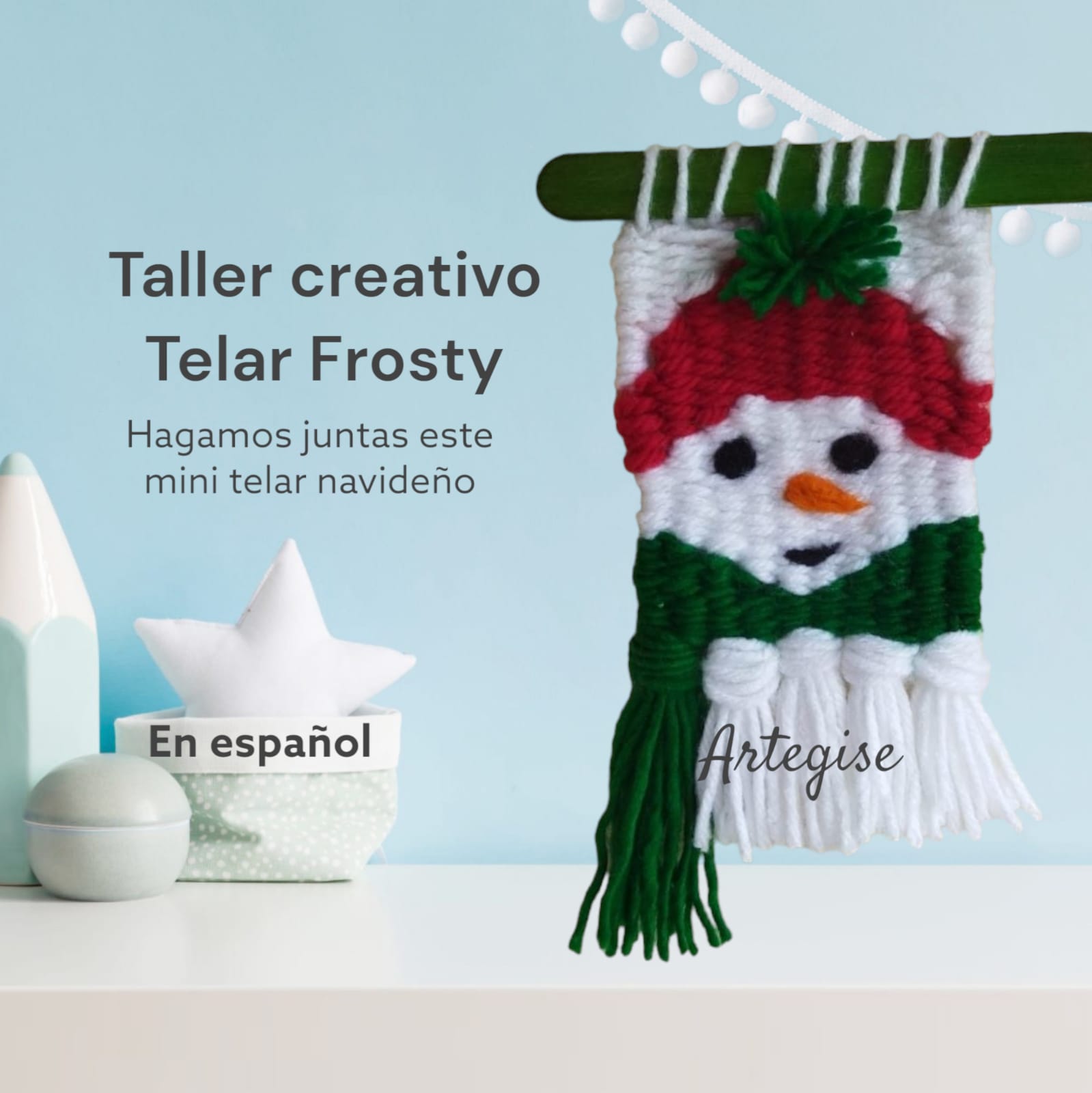 Navidad está en el aire y la decoración navideña en tu hogar nunca es suficiente. ¡Te encantará el Mini Telar Frosty! Soy Gise de Artegise y te invito a que aprendas, paso a paso a realizar este hermoso mini telar navideño, de principio a fin y podrás adaptarlo al tamaño que quieras. Podrás realizar cuantos mini telares quieras para ambientar tu hogar e incluso estarás en condiciones de crear tus propios diseños navideños. Si te encanta la navidad, te encantará este telar donde aprenderás a realizar el bastidor donde tejerás el mini telar, realizarás la urdimbre, harás los flecos, la bufanda, la carita, el gorro, el pompom. Sacarás el telar del bastidor, aprenderás a darle las terminaciones a tu telar como esconder las hebras y así quede profesional tu trabajo. Aprenderás a realizar los ojos, la boca y la nariz de Frosty. Aprenderás el punto base de telar, aprenderás a cambiar de colores y a tejer en plano y en desnivel. Aprenderás a darle los cortes precisos a los flecos y al pompom del gorro de Frosty. Aprenderás a colocar el palito sujetador del mini telar, desde el cual podrás colgar en cualquier parte de tu hogar. También podrás realizar para regalar en época navideña. Un regalo hecho a mano, es un regalo desde el alma de quien lo crea, pues en el proceso hubo emociones que quedan plasmadas en tu creación. ¡Manos a la obra!