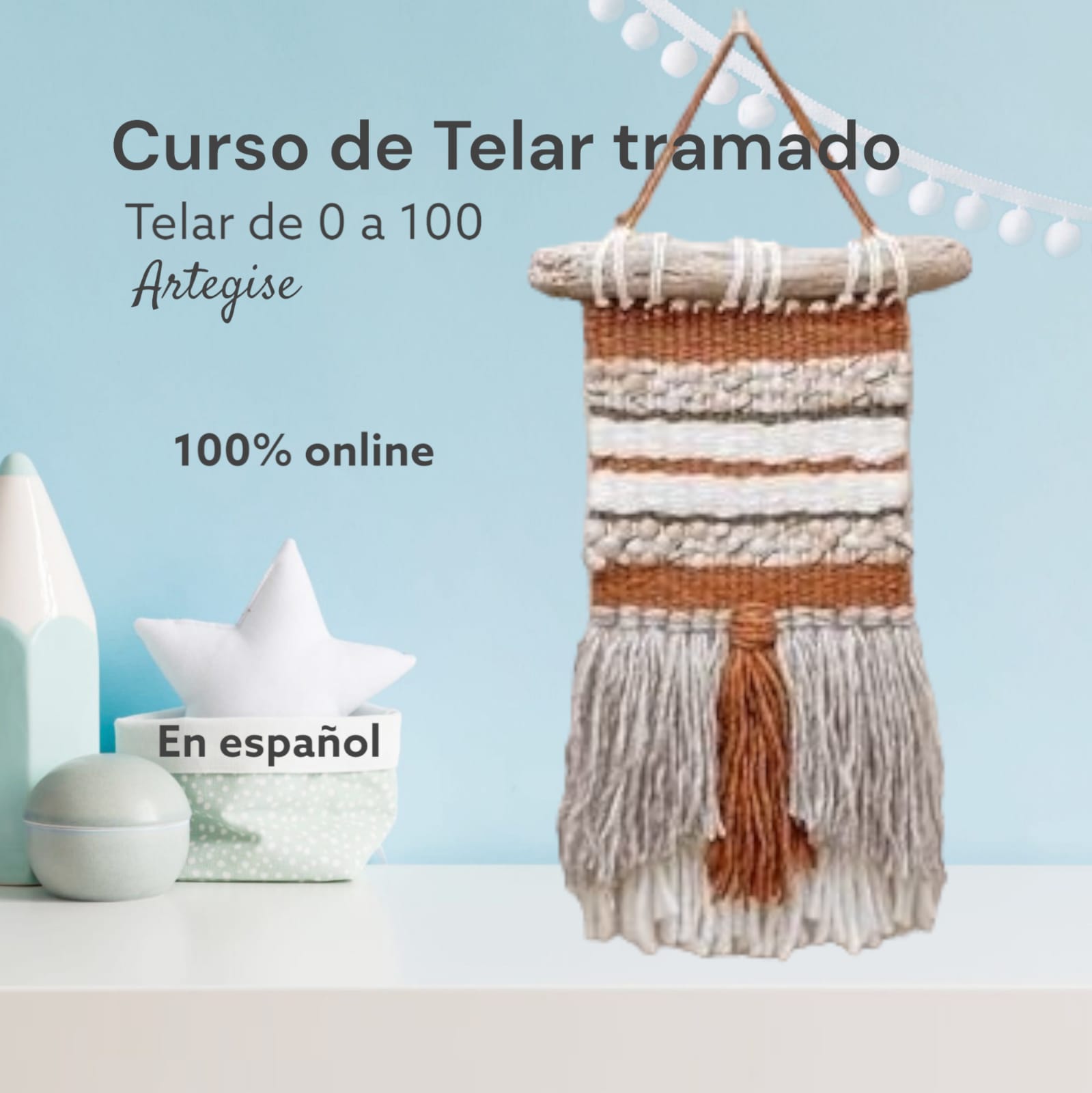 Soy Gise de Artegise y te invito a que aprendas a tejer en telar en mi curso on line. Para realizar este curso, no necesitas conocimientos previos, dado que iniciaremos desde lo más básico, hasta que comiences tu primer proyecto, dando como resultado, tu primer telar decorativo.