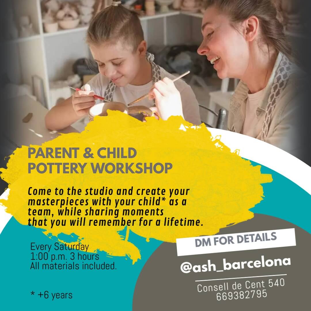 Join me every Saturday afternoon from 13:00-16:00 at Ash_Barcelona for a special parent and child ceramic workshop. Create unforgettable memories as you embark on a creative journey together.