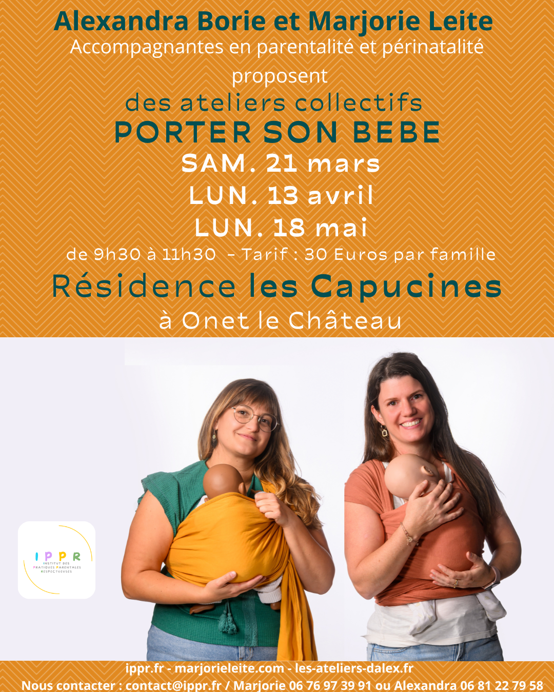 Monitrices de portage certifiées par le Centre National de portage des Bébés (aujourd'hui devenu EDPP, Ecole des Professionnels de la périnatalité), accompagnantes en parentalité et en périnatalité, nous vous proposons de découvrir la pratique du portage en écharpe et porte-bébé et ses bienfaits lors d'un atelier collectif de 2 heures au sein de la Résidence les Capucines à Onet-le-Château.