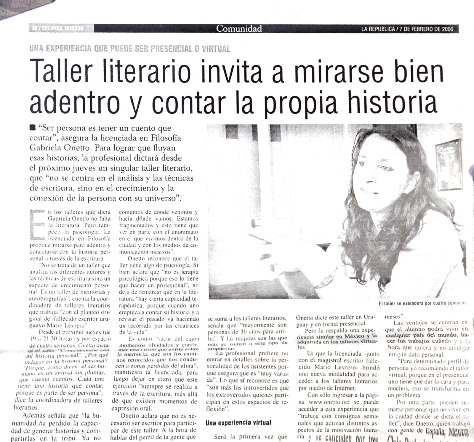 "Conectándome con mi historia personal" es uno de los talleres insignia de Gabriela Onetto, una "experiencia transformadora de escritura autobiográfica" que se ha impartido en 22 ediciones desde 2006. Se ofrece en formato online y multimedia, con una duración de dos meses. El taller está diseñado para ser un "viaje a lo desconocido", sin revelar a los participantes el programa detallado de antemano. La metodología es práctica-teórica y se inspira en el concepto del "viaje del héroe/heroína" como una forma de organizar la experiencia vital. Incluye componentes asincrónicos semanales con materiales multimedia (videos, audios, lecturas) y consignas de escritura, así como retroalimentación personalizada de la facilitadora y los compañeros en una plataforma privada. Además, cuenta con un grupo privado de Telegram para audiolecturas e intercambios informales. Se complementa con tres encuentros sincrónicos estratégicos vía videoconferencia (GoBrunch): una sesión inicial para construir comunidad y establecer un "pacto de secreto literario", una sesión intermedia con visualización creativa y revisión de obstáculos, y una sesión final para integrar los aprendizajes y analizar el proyecto autobiográfico. Un aspecto fundamental es el "pacto de secreto literario" que garantiza la confidencialidad de las vivencias compartidas por los participantes.