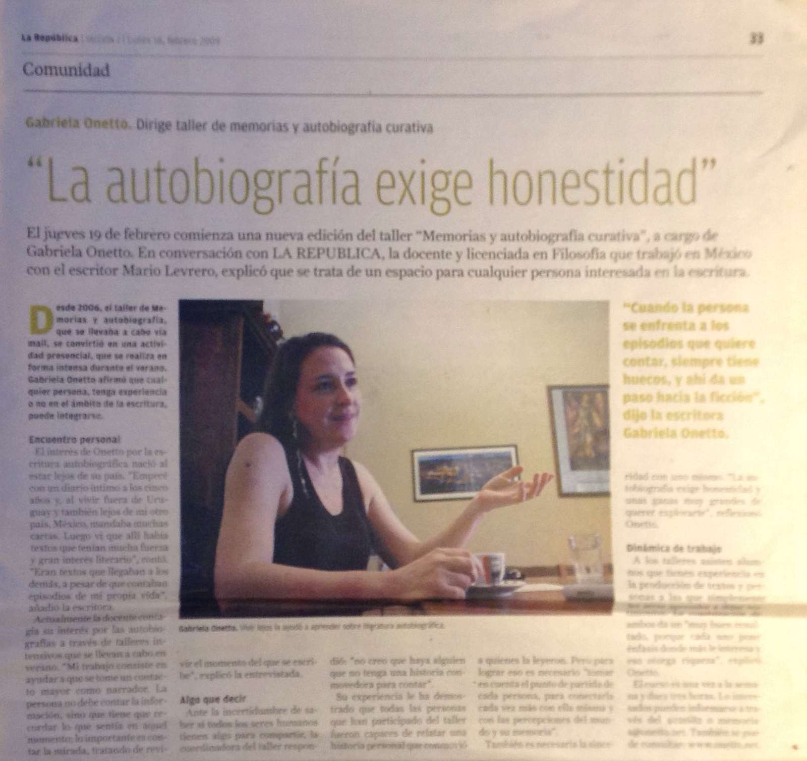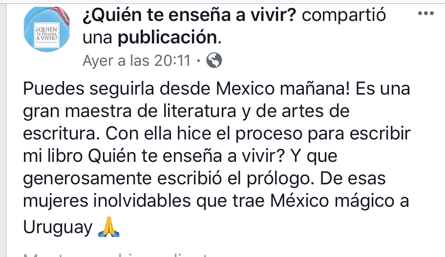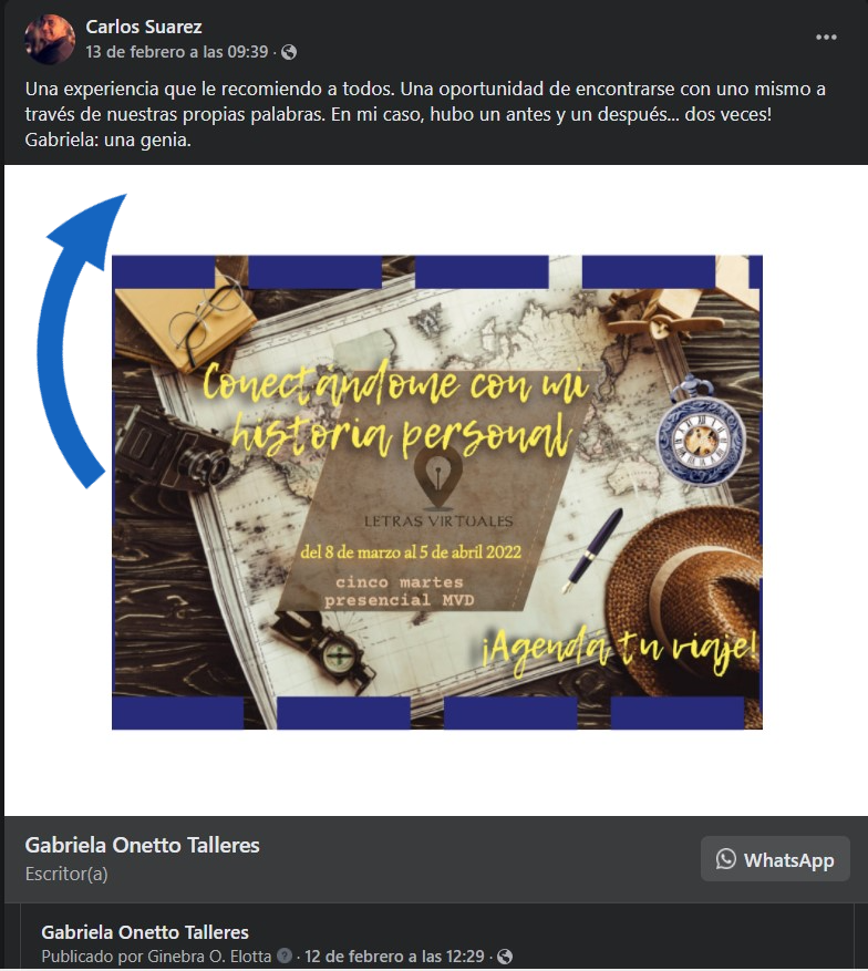 Y de todo ello, la autobiografía es la más alta expresión. En cuanto al tema de este taller en particular, desde niña he sido entusiasta lectora y escritora de material autobiográfico: diarios, cartas, memorias, apuntes, registros oníricos, testimonios, todo formó parte del combustible con el que desconocidos afectos entrañables (a menudo de otros siglos) me acompañaron y dieron fuerzas, así como del rastro personal escrito que yo misma construyo naturalmente, como una araña. De ahí mi interés en compartir el viaje, con la invaluable recompensa de constatar que muchos otros también percibían su llamado a la aventura. Años después de creada esta propuesta (2003 por internet, 2006 presencial), asistí a dos cursos académicos que me acercaron su bagaje teórico con valiosos elementos para la reflexión sobre el registro de la historia propia y sus fenómenos específicos: Escribir la vida: teoría y práctica del diario y la autobiografía (17, Instituto de Estudios Críticos/ México, 2012) y Género autobiográfico y el escritor Mario Levrero (IPES/ Uruguay, 2014). También integré durante dos años el GEA/Grupo de Estudios Autobiográficos con investigadores de diversas áreas académicas. Pero creo que lo más importante de toda esta presentación es contar que me apasiona acompañar a otros en el proceso de descubrir o afianzar la muchas veces escondida capacidad de “escribir poniendo el alma en lo que se escribe” (como decía Levrero). Y esto, en el caso del territorio de la historia personal, es doblemente importante. Le tengo un cariño muy particular a este taller de memorias y autobiografía curativa, por el enorme impacto que ha tenido en muchísima gente a lo largo de los años, y por los milagros que ocurren cuando uno pone “toda la carne en el asador”. Eso va tanto por los valientes participantes como por yo misma, que estoy a cargo de que el barco llegue a puerto y en buena forma. Conectándome con mi historia personal se ha realizado en Montevideo ininterrumpidamente cada febrero/marzo desde el 2006 (solo una vez al año y con cupo muy limitado, a veces con dos grupos por la demanda) como taller intensivo de verano; solo en el 2021, por la complicación sanitaria y la inminente suspensión de las clases presenciales, la cita estival no se concretó. Sin embargo, sobre finales de año se estrenó esta nueva modalidad grupal online que echó mano de todos los recursos que hoy tenemos a disposición (mailing con las entregas semanales, grupo privado de Telegram con potenciales diversos, audios o videos cuando corresponda, tres encuentros sincrónicos "por Zoom"), por lo que no se ha roto el heroico viaje de los autobiografistas uruguayos, y desde el 2022 tengo la alegría de volverlo a convocar en su formato presencial de cinco semanas intensivas e intensas, sumado a eventuales convocatorias para realizarlo por internet, como esta. ¡El próximo 27 de septiembre iniciaremos la vigesimotercera edición de un taller imborrable!».