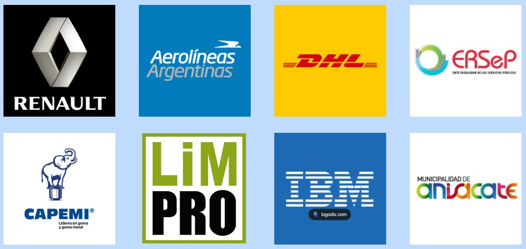 Hemos trabajado y capacitado en numerosas empresas y organizaciones nacionales como Renault Argentina, Aerolíneas Argentinas, ERSeP, DHL, MCL, Giacomeli-Capemi, LimPro entre otras, como así también, en la Universidad Nacional de Córdoba y en distintas municipalidades de la provincia de Córdoba.