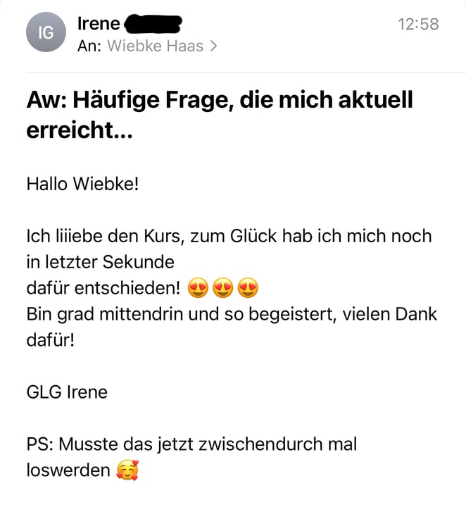 Aber warum schreibe ich Dir das? Ich möchte Dich motivieren Deinen eigenen Visionen nachzugehen. Dich zu trauen und vor allem DIR und deinen Fähigkeiten zu vertrauen. Auf diesem Weg begleite ich dich gerne und gebe dir mein geballtes Wissen in zahlreichen Kursen an die Hand.