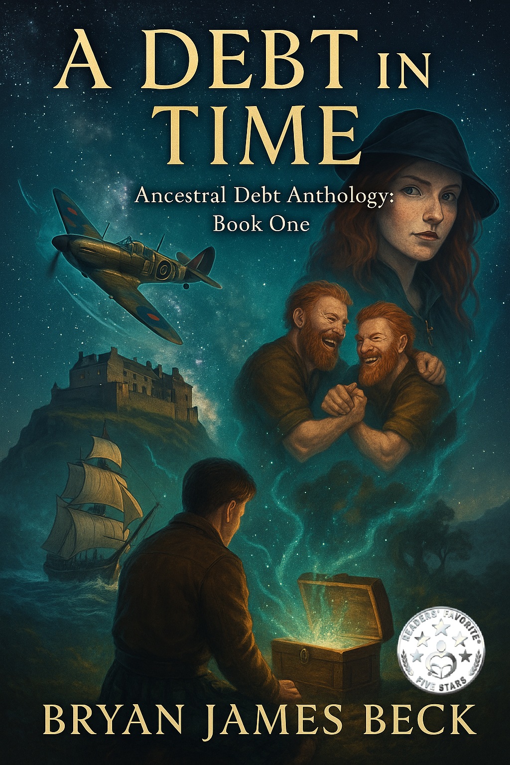 "James doesn’t feel like he fits in anywhere. He’s different, and the kids at school are happy to point that out to him. In fact, his girlfriend just broke up with him and even called him a loser-told him he was going nowhere. As if things couldn’t get any worse, he had a horribly vivid dream last night that scared the snot out of him, and now his truly torturous teenage boss at the movie theater says he can’t have time off to go to his grandfather’s funeral. James may be different than most of the kids, but he’s smart enough to know what’s important, and family comes before this crummy job with Torquemada for a boss. So, he accompanies his mother to Grampy’s funeral, only to discover that the grandfather he hardly remembers left him something in his will. James has been given a box- well, a chest- that seems like it’s ancient. He’s given specific instructions about it, and how/when/where he should open it. Following the instructions, he opens the chest to a flash of light, a falling sensation, and total confusion on his part. Instead of being in Grampy’s old house, he’s now in a... forest? It’s cold, quiet. But there’s smoke nearby. He’s got to be dreaming. Hey, remember the ex-girlfriend who told him he was a loser and was going nowhere? Well, she was totally wrong. Because James is about to discover that he’s traveled so far back in time, he’s now in Ancient Scotland, facing two massive ginger-colored brutes who resemble Vikings as much as anything else. Michael and Jaime are wearing kilts, carrying archaic weapons, and are beginning to realize that the three of them are actually related. Cool. A Debt in Time is actually the first book in the Ancestral Debt Anthology by Bryan James Beck. Ancient Celtic magic has forced James into becoming an unwilling time traveler. He has no idea what he’s doing or how he’s supposed to survive, much less carry out the objective the Celtic witches laid out in the original curse. He also thinks this has got to be some great big karmic mistake, because he is not worthy to be the hero this ancient magic requires. It felt like a scene straight out of Indiana Jones, but this time, James wasn’t the hero swinging in to save the day—he was the poor sucker walking to the altar. Within this fast-paced, adventurous first installment, James will travel from medieval Scotland to WWII-era Britain. He’ll find himself held prisoner aboard a pirate ship, travel to the New World, and even face that crazy dream he had before coming to the funeral, the one where he’s about to get a mace in the head by some knight wearing medieval armor in a swamp that has James too bogged down to save himself. Along the way, James will discover things about history and the world in general that he never knew. He’ll experience what it’s like to fight in the dogfights over the London skies with Nazi bombers doing their best to obliterate the Brits. He’ll learn to fight with a sword, a cutlass, a knife, and his wits alone. He’ll learn what it’s like to be truly hungry, truly cold, and 100% frightened. But most important of all, James will learn what his character is actually made of. He’ll learn that being courageous doesn’t mean being unafraid. He’ll learn, best of all, that his Grampy was right; James is smart enough, strong enough, and tough enough not only to survive but to meet his challenges head on and end this generational family curse.