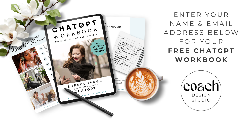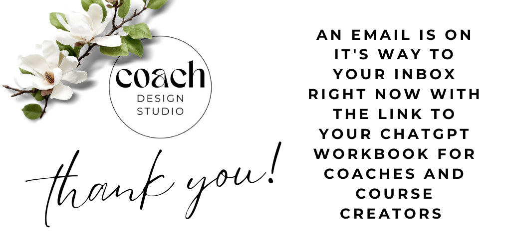Get your FREE ChatGPT Workbook for Coaches and Course Creators, and join my Coach Design Studio email list to receive regular newsletters with goodies such as discount codes, special offers, new product launch information and other exciting stuff to help you easily build and grow your business.