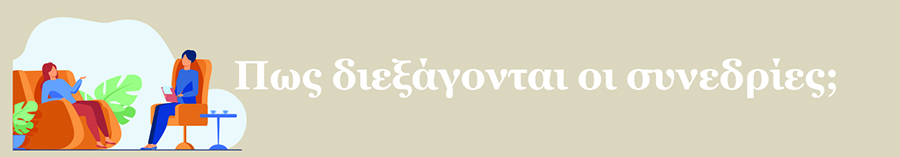 Οι συνεδρίες διαρκούν 45΄ και πραγματοποιούνται είτε δια ζώσης στο γραφείο στο Περιστέρι Αττικής, είτε διαδικτυακά μέσω της πλατφόρμας Teams, η όποιας άλλης διαδικτυακής πλατφόρμας σας εξυπηρετεί.