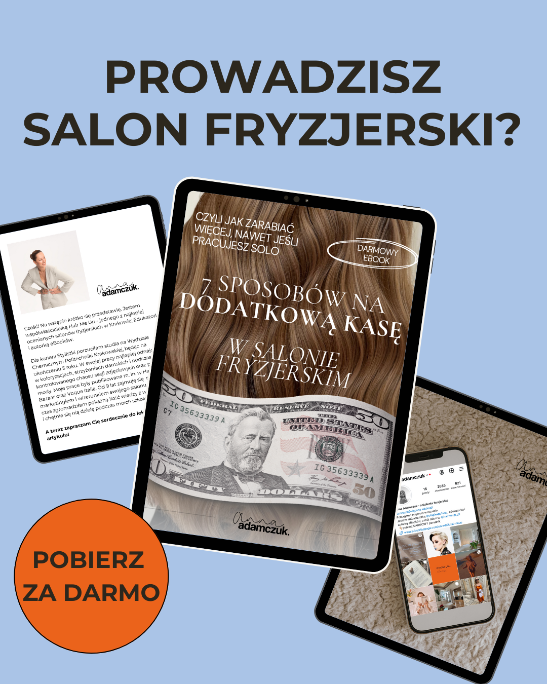 Nazywam się Anna Adamczuk i jestem założycielką Hair Me Up - jednego z najlepiej ocenianych salonów fryzjerskich w Polsce; edukatorką, autorką eBooków oraz certyfikowaną mentorką właścicielek salonów fryzjerskich.