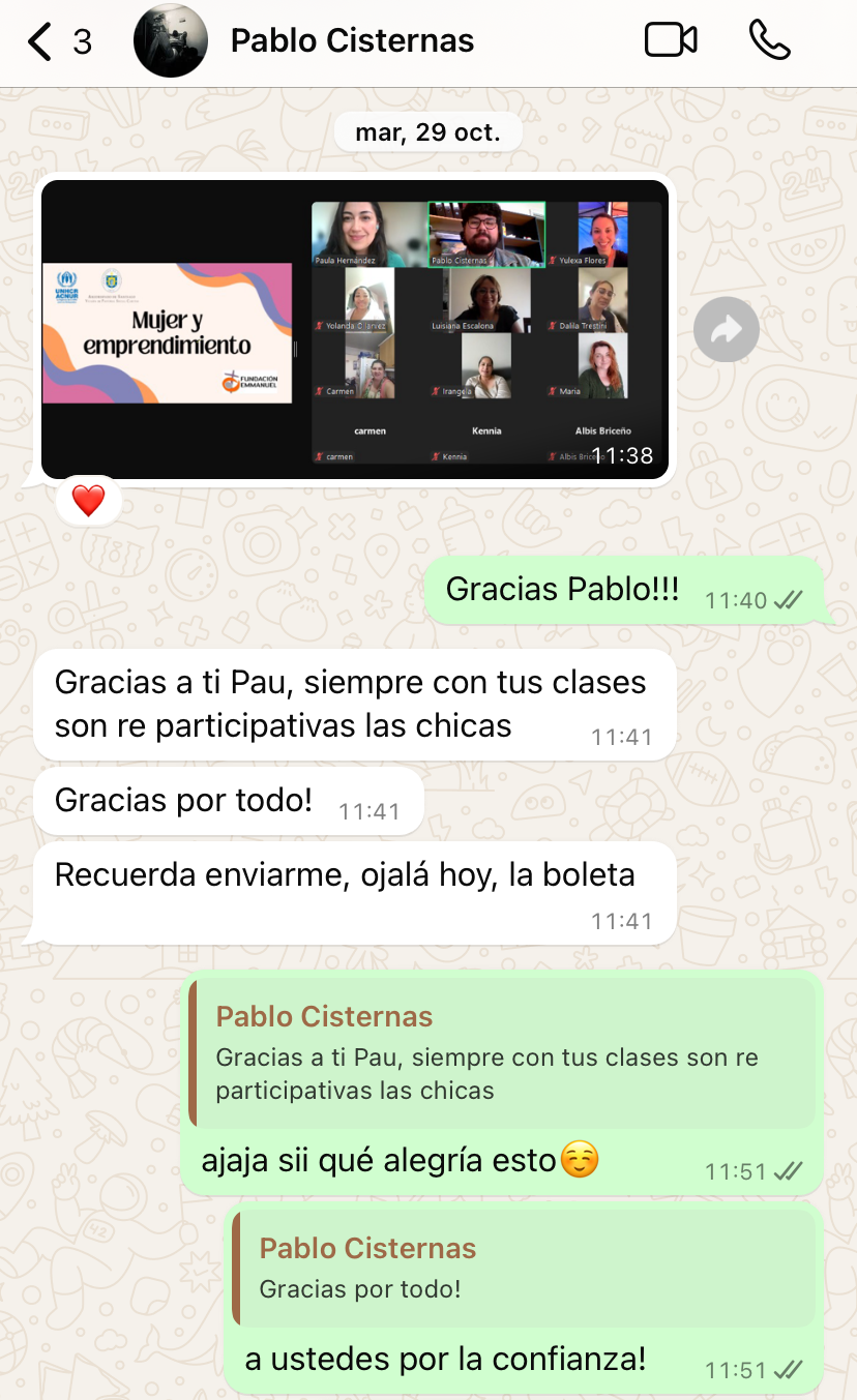 Taller online a mujeres emprendedoras, (en su mayoría migrantes), en colaboración con el Arzobispado de Santiago- Vicaría de Pastoral Social Caritas.