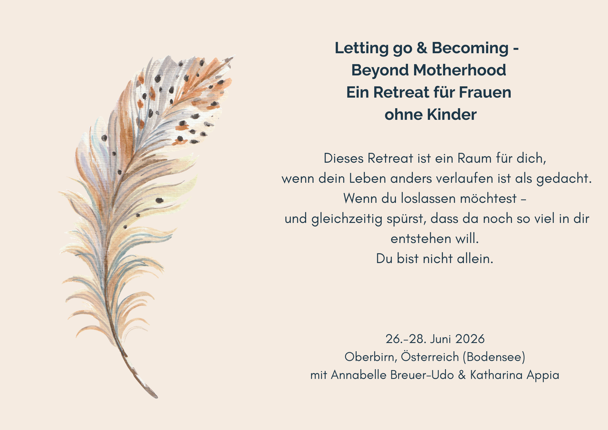 Wir weisen ausdrücklich darauf hin, dass unser Retreat „Beyond Motherhood“ keinesfalls einen Arztbesuch, ärztliche, psychotherapeutische oder sonstige heilkundliche Behandlung und diagnostische Tätigkeit ersetzt. Verschriebene Medikamente dürfen keinesfalls ohne Absprache mit dem behandelnden Arzt abgesetzt oder anders als verschrieben eingenommen werden. Wir geben keine Heilversprechen ab. Es handelt sich nicht um Ausübung der Heilkunde im Sinne der gesetzlichen Vorschriften. Das Retreat ist ein ganzheitliches Coaching mit dem Ziel, Frauen, die ihre Kinderlosigkeit betrauern, zusammenzubringen und zu stärken.