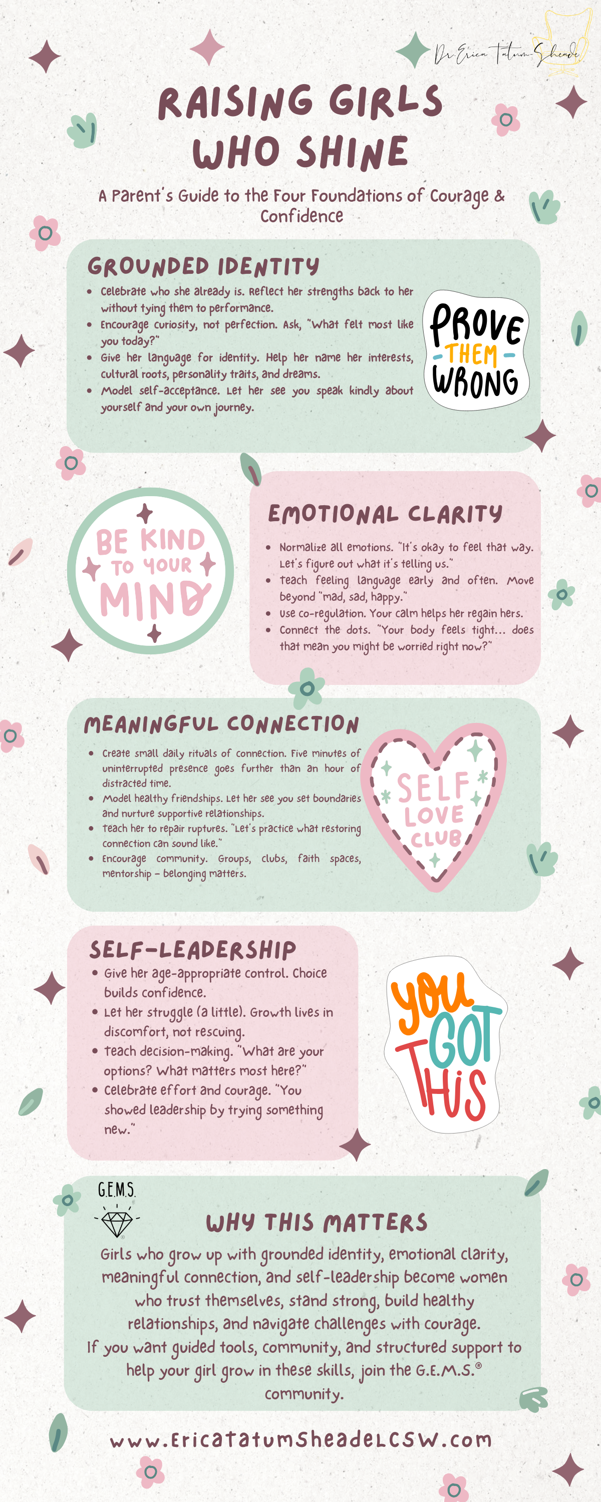 The G.E.M.S. Method™ is a research-informed framework created by Dr. Erica Tatum-Sheade to help girls build identity, courage, and connection in a world that often asks them to shrink.