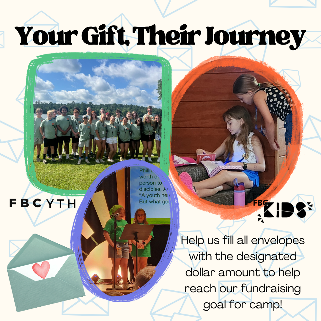 You will find envelopes on display in the Welcome Center and in the Family Life Center (near the FBC Griffin sign). We invite you to take an envelope, add your donation, and then turn it in to the office or drop it in the offering plate on Sunday morning. Your donation supports our fundraising efforts for summer camps for our children and youth.