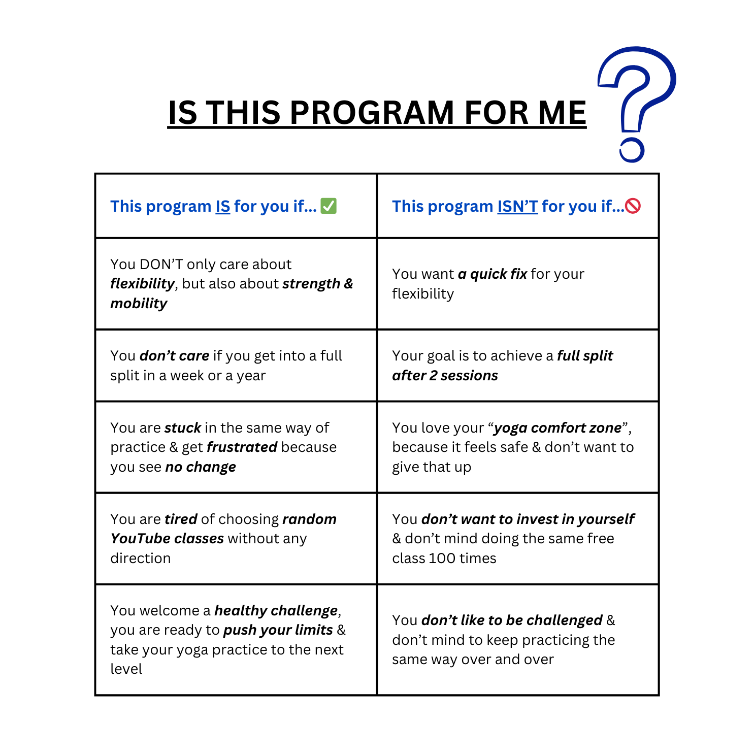 Nothing would make me happier than all of you becoming the Strong & Flex students, but... I know this program is NOT for everyone (and that's kinda the point). Check the table on the right to see if it is a fit.