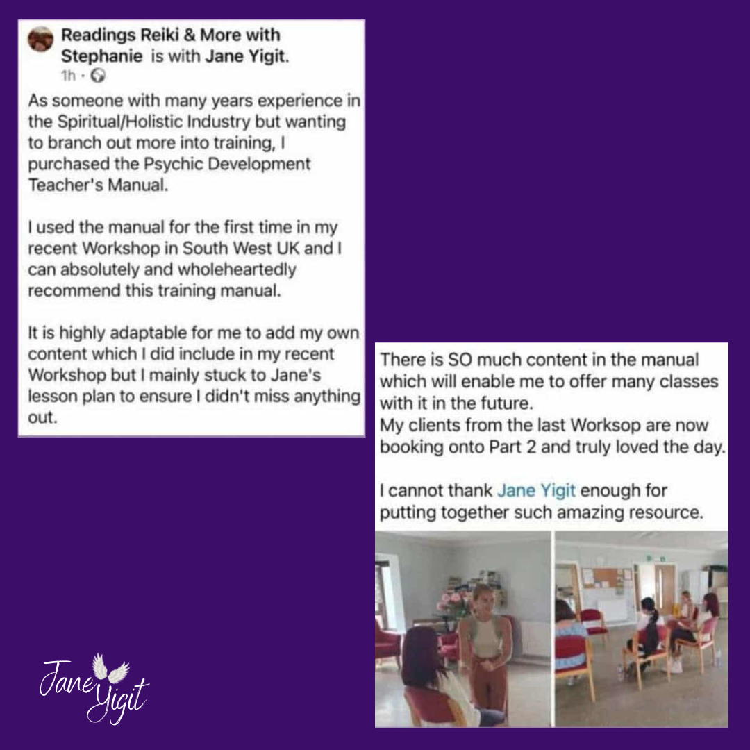 The basis of my workshops is my 90-page full colour “Developing Your Psychic Self” workbook. This is designed to be easy to navigate and contains 6 themes that classes are based around. See photos below for content and provable reviews. It is packed with theory and practical exercises that my classes love, and designed to be screenshot as albums to provide slides for Zoom, or simply to read out key points in a face-to-face class. This is ideal if you want to pick and mix and/or design your own classes and is sent as one downloadable document.